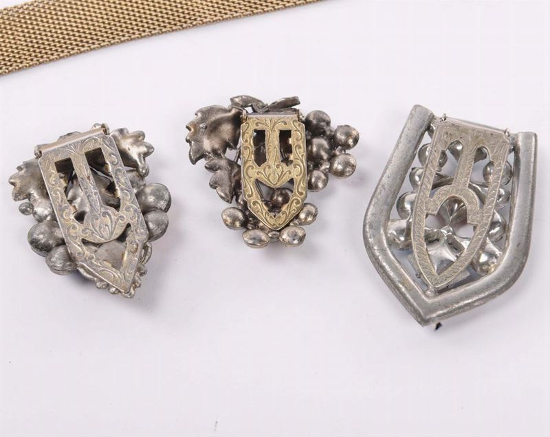 composto da cinque ferma foulard in metallo e strass e paste vitree, tre bracciali tra cui due con cammei ed una spilla in argento e pasta vitrea viola