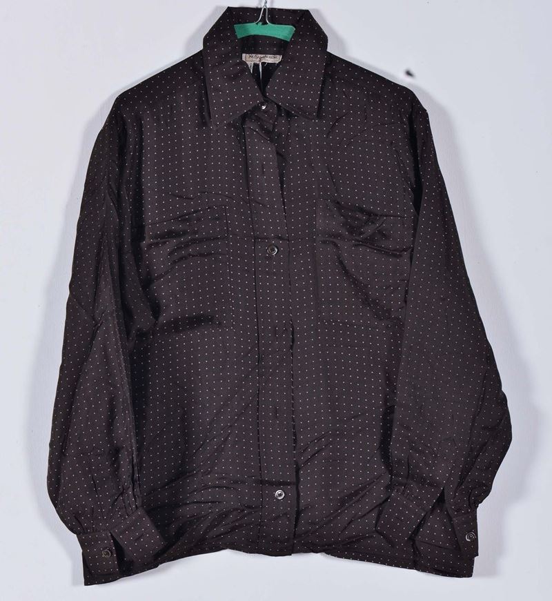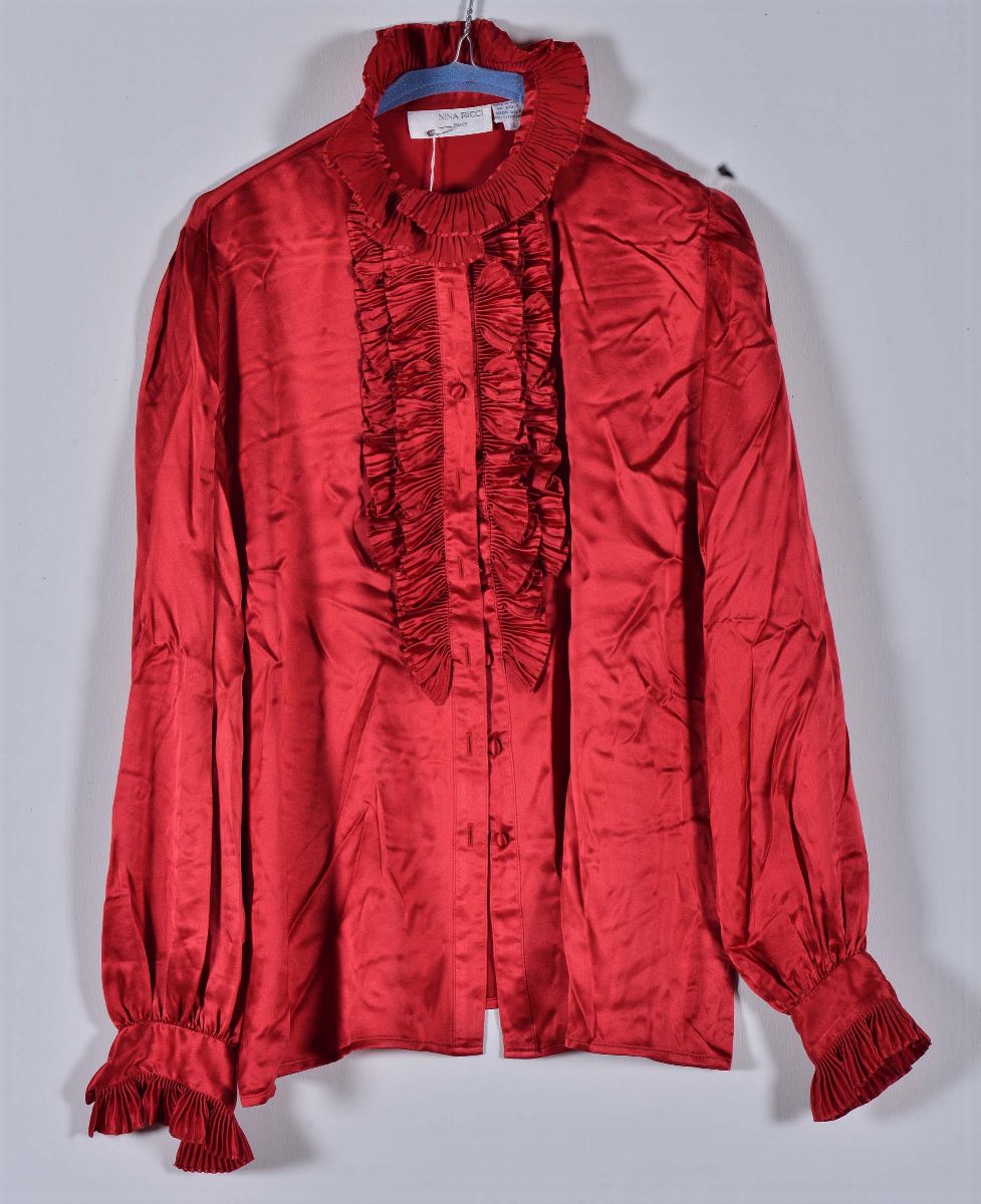 composto da : Yves Saint Laurent, blusa in seta marrone con pois beige taglia 46 e Nina Ricci, Blusa in seta rossa jabot plissettato taglia 46