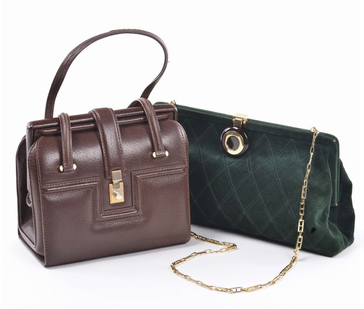 composto da: una borsetta in nabuk con chiusura dorata e pietra dura a due manici e borsa a bauletto in cuoio marrone con due manici, anni '40