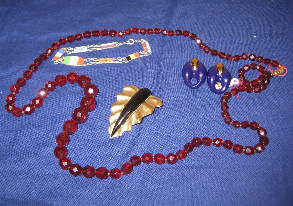 comprendente clip in metallo dorato e nero a forma di foglia coppia orecchini in metallo dorato e smalto blu braccialetto di metallo con bandiere in smalto collana lunga un filo di pietre di vetro ad imitazione granati.