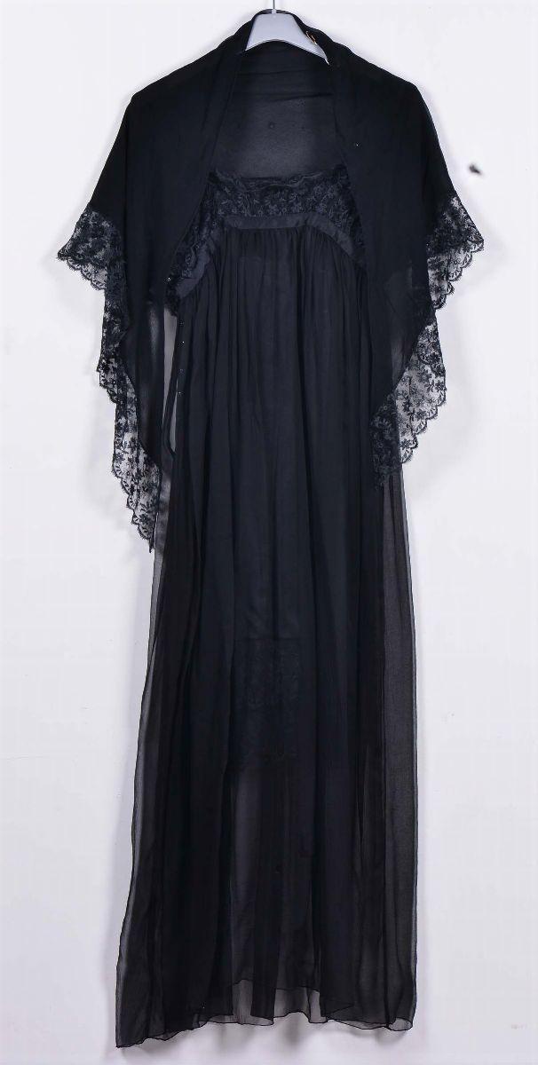 lungo in chiffon nero trasparente con sotto vestito corto e corpino con pizzo Chantilly, completo di scialle a triangolo, taglia 40, anni '80