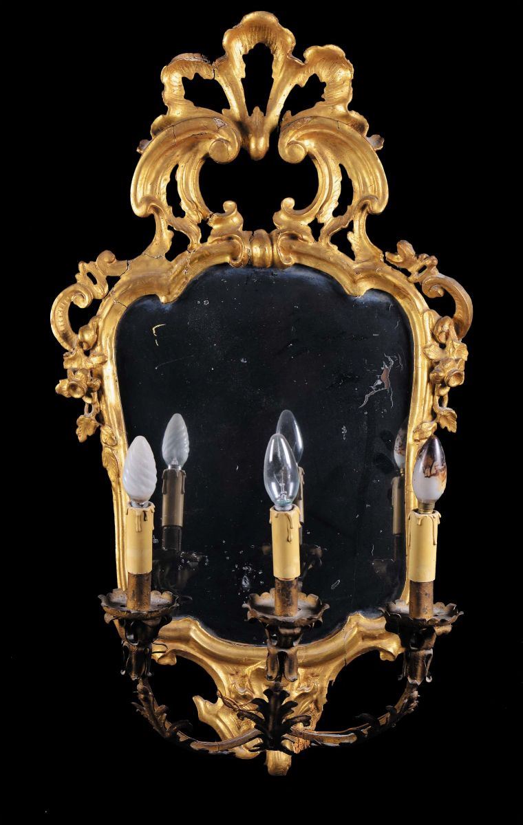 Coppia di appliques a tre luci in legno intagliato e dorato, XVIII secolo