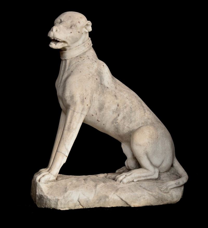 Coppia di cani seduti in marmo bianco, XVIII secolo