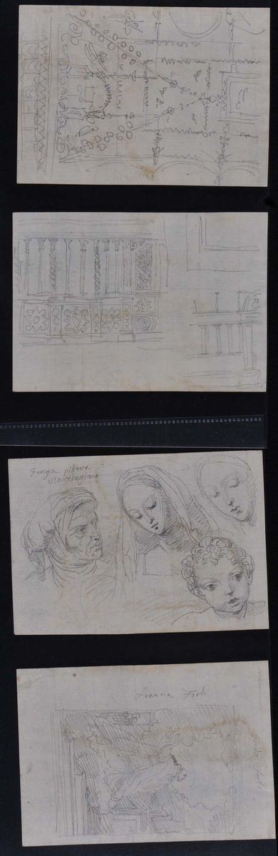 quattro bozzetti a matita su carta, cm 12x17 circa, sul retro altri bozzetti con studi di interno e figure