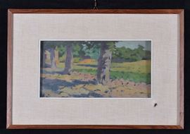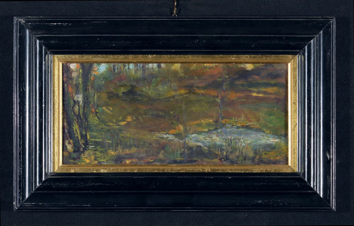 olio su cartoncino, cm 14x28, nel lotto anche altro dipinto ad olio su tavoletta con paesaggio boschivo, cm 16x35