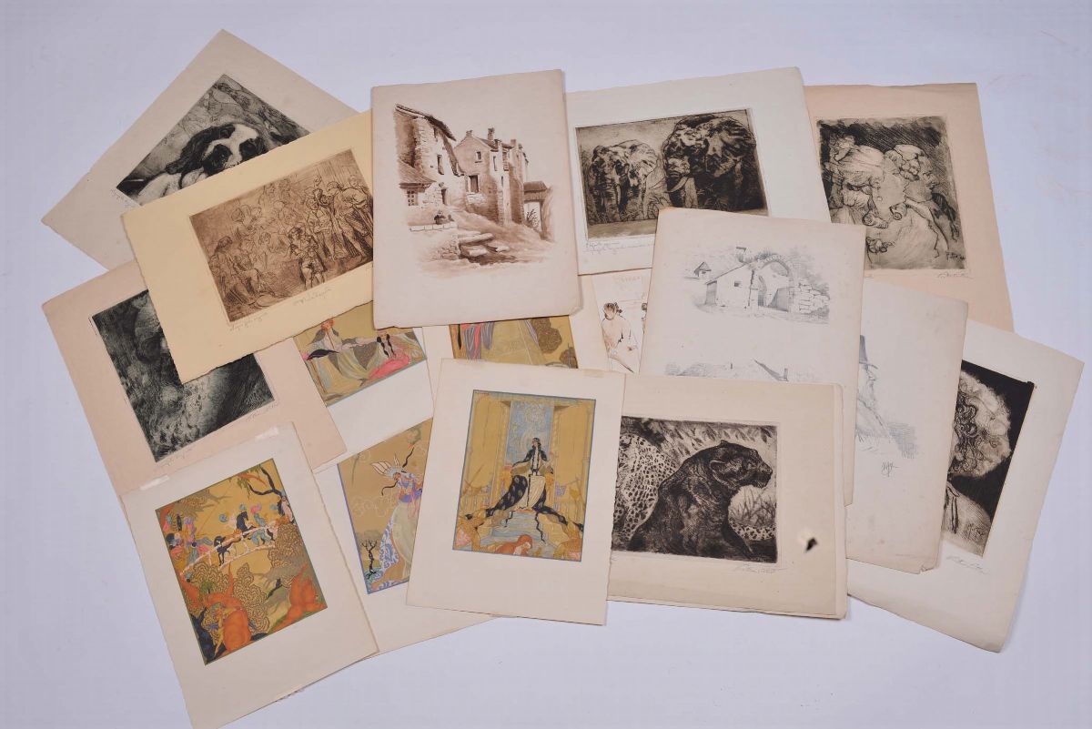 Lotto composto da otto disegni del XIX secolo e cinque acquerelli Liberty