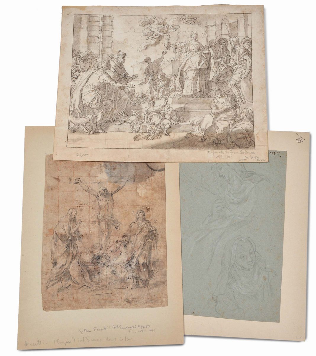 disegno copia da Francesco Solimena, cm 27x34, Crocifissione del XVII secolo, cm 23x17 e da studio di suora di scuola bolognese del XVIII secolo, cm 26x18