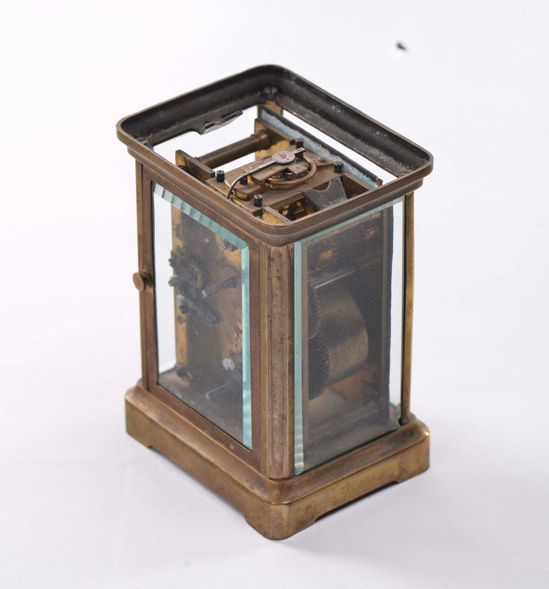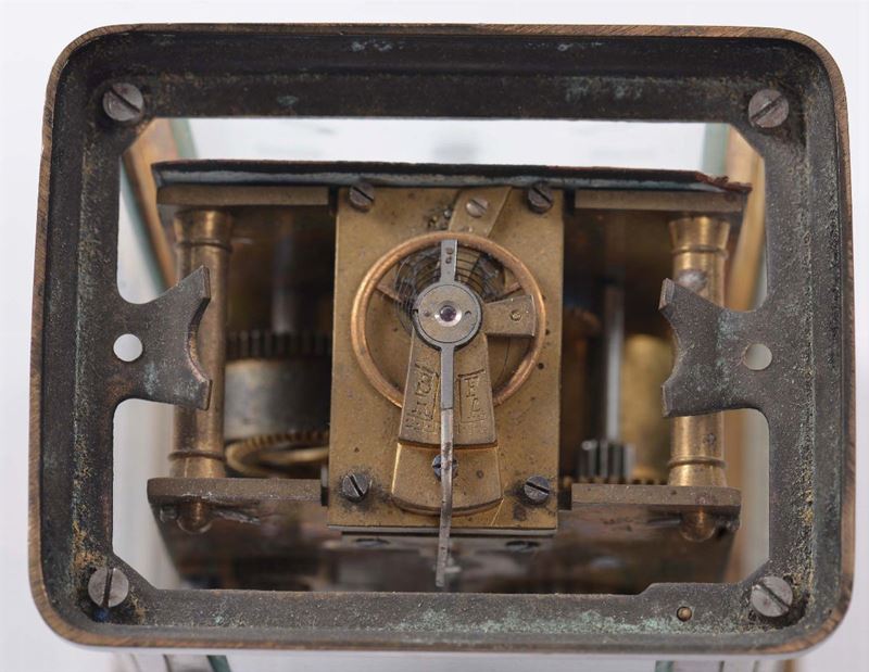 quadrante smaltato con numeri romani, cm 8x7x12, in custodia (difetti e mancanze)