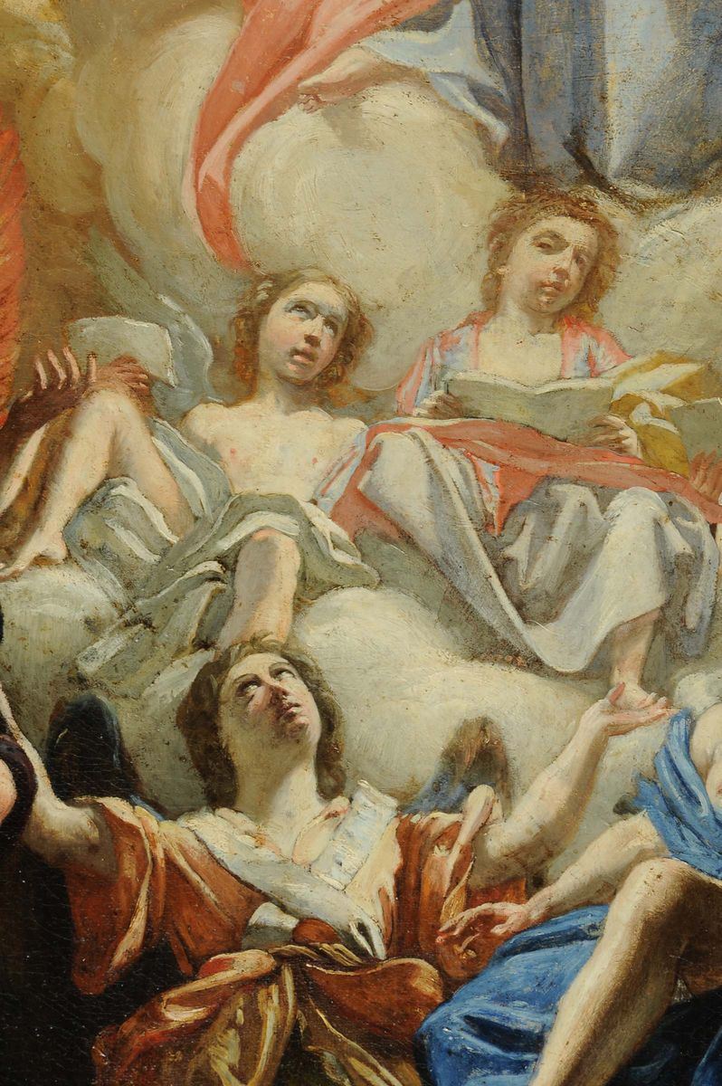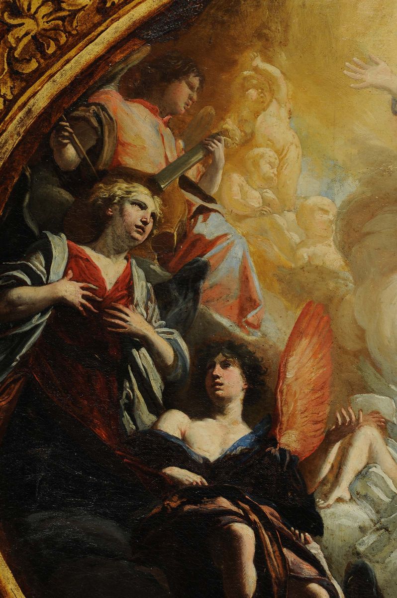 Il dipinto (in prima tela), di cui non si conosce la provenienza, costituisce una recentissima, preziosa aggiunta al raro catalogo di Orazio Riminaldi. Ci è stato segnalato, ormai in chiusura di libro, da Paola Betti che per prima lo ha correttamente attribuito al maestro pisano (c.s. 2 dicembre 2011). Raffigura il Padre Eterno circondato da una gloria di angeli mentre suonano e cantano in atteggiamenti estatici, di adorazione e di preghiera. La scena è raffigurata entro una cornice polilobata di sapore protobarocco, dipinta a imitazione del legno dorato. Si tratta ad evidenza di un modello preparatorio per un’opera a tutt’oggi non rintracciata e neanche ricordata dalle fonti a noi note, verosimilmente il soffitto di una cappella in una residenza privata oppure di un edificio di culto. Il fatto che si tratti di un modello lo si deduce anche dalla quadrettatura ‘di riporto’ ben leggibile nella zona che circonda la figura del Padre Eterno, evidentemente delineata per facilitare la trasposizione nel formato definitivo della composizione. L’attribuzione poggia su confronti con opere autografe di Orazio Riminaldi. Il volto dell’angelo dalle ali iridescenti e a mani giunte seduto sulla destra, sia nella fisionomia che nell’espressione estatica, è sovrapponibile all’Orfeo intento a suonare la lira nell’Orfeo ed Euridice della Collezione Koelliker. L’angelo che lo sovrasta rimanda all’Icaro nella tela di Hartford per via dello sguardo fermo e penetrante così intensamente volto verso lo spettatore, le palpebre sottolineate, le labbra atteggiate in un’espressione vagamente altera e il braccio allungato in un gesto declamatorio. Tipica di Riminaldi è la resa dei passaggi chiaroscurali, densi e profondi nella zona marginale della composizione, delicati nella parte centrale dominata da una luminosità abbacinante. Brani di particolare suggestione sono individuabili nelle gambe dei due angeli dalle ali spiegate, con effetti di luce radente, dalla fitta oscurità che le avvolge e nella sagoma cupa che il braccio piegato proietta sul busto di quello orante sulla destra. In generale l’opera è caratterizzata da una raffinatissima distribuzione delle luci sulle emergenze somatiche, da una cromia ricca di retaggio tardomanieristico, fatta di cangiantismi che variano nelle tonalità più diverse: dall’azzurro al blu petrolio, agli aranci, i rossi, i bruciati, l’avorio, il verde salvia. Del resto, analoghi effetti di iridescenza si riscontrano in numerosi particolari di opere di Riminaldi quali la veste del Buon Samaritano e il manto svolazzante di Giunone che mette gli occhi di Argo sulla coda del pavone. Tipico della definizione del modello è la stesura del colore applicato in modo sintetico tramite pennellate talvolta brevi, talaltra filamentose distribuite in modo rapido. L’influenza di Lanfranco si riscontra nella delicatezza del chiaroscuro, nella sintesi delle forme mediante una stesura decisa seppure compendiaria della materia pittorica, cosicché il modellato anatomico acquista un aspetto morbido e plastico nel contempo. Le espressioni languide degli angeli seduti sotto il Padre Eterno rimandano invece a certi modelli del fiammingo Nicolas Régnier, mentre a Simon Vouet rimandano le preziose modulazioni tonali e la notevole perizia grafica. Il fregio leggermente quadrilobato campito da motivi vegetali fa dedurre che anche per questa composizione fosse prevista una cornice lignea che assolvesse alla funzione di introdurre alla visione della volta paradisiaca, proprio come nel caso della cupola ellittica del Duomo di Pisa con l’Assunzione della Vergine e santi, in origine delimitata da un cornicione in legno intagliato e dorato eseguito da Giovan Battista Riminaldi. Per quanto riguarda la cronologia, sulla base degli elementi stilistici così marcatamente protobarocchi, seppur venati da naturalismo, se ne propone una datazione negli ultimi anni di attività del pittore, in coincidenza con l’impresa della cupola per il Duomo pisano, in prossimità anche della Vestizione di santa Bona.