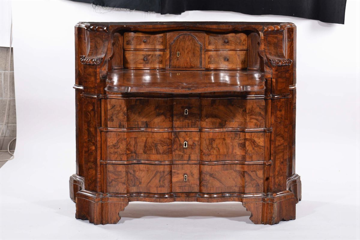 tre cassetti sul fronte ad andamento mistilineo separati da cornicette modanate più uno piccolo in alto, montanti con sfaccettatura concava terminanti con riccioli scolpiti, calatoia sagomata con cornicetta scanalata che cela cassettini e antina centrale, piedi a ciabatta, cm 140x64x106
