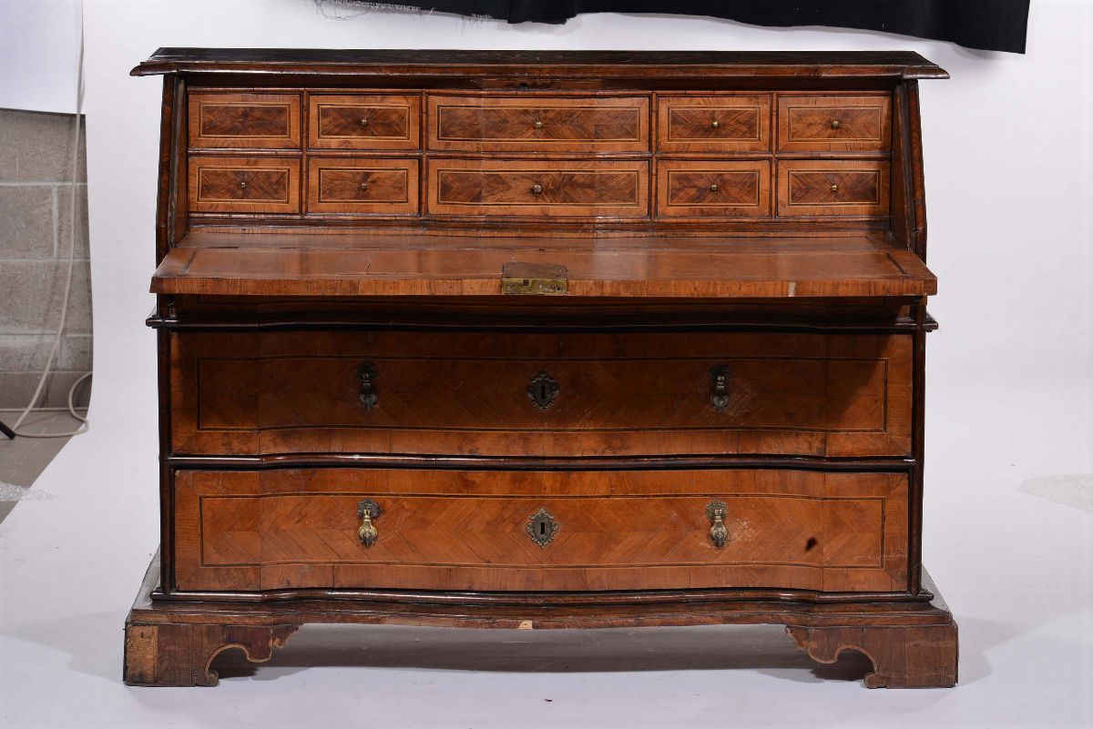 fronte mosso a due cassetti, cornicette ebanizzate, calatoia che cela cassettini e vani segreti, cm 149x61x106