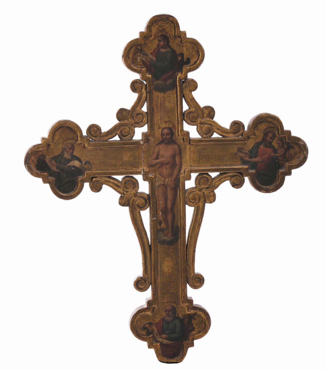 croce dipinta su entrambi i lati a tempera su tavola con Santi e Crocifissione, cm 42x34