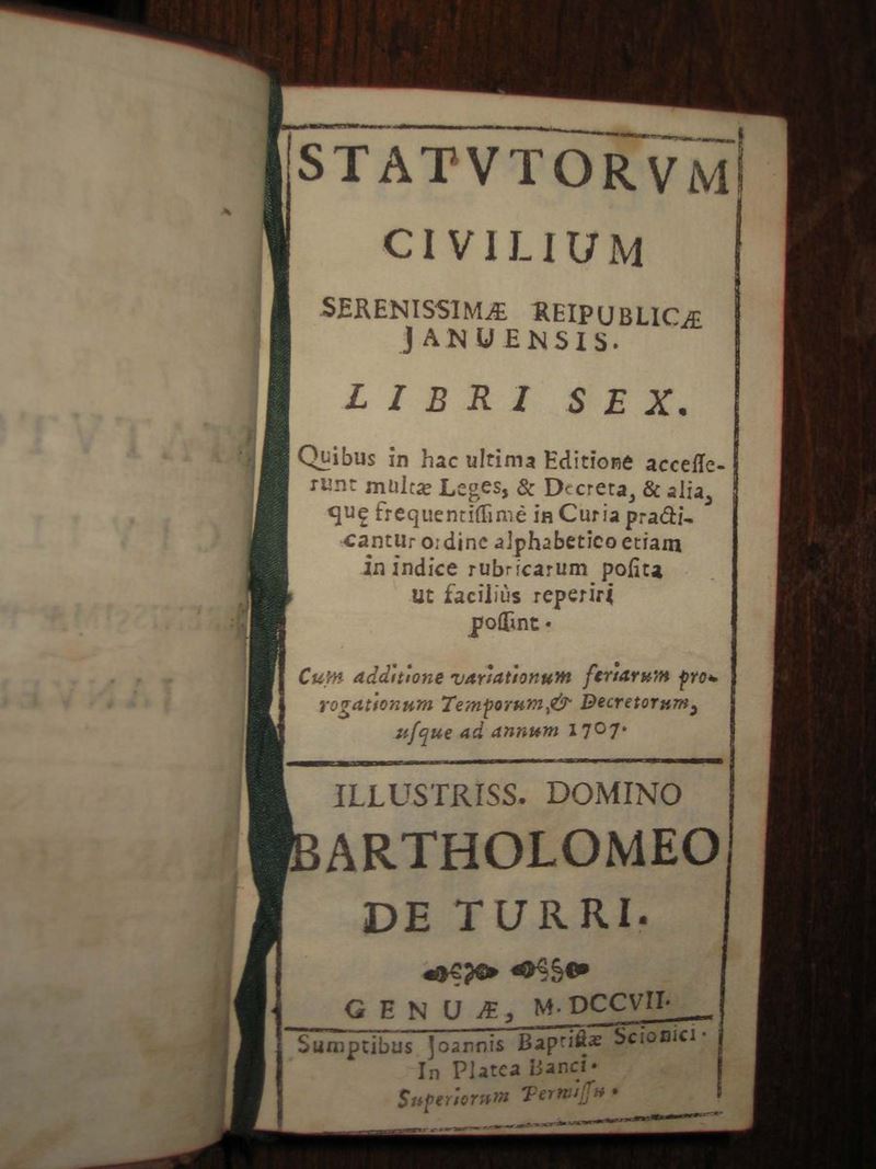 Genova, Calenzani, 1674. Nel lotto altro volume: Statutorum civilium, Genova, Scionico, 1707