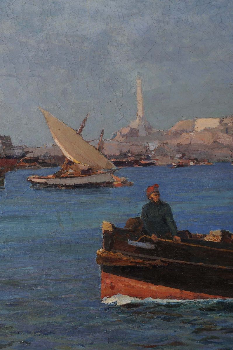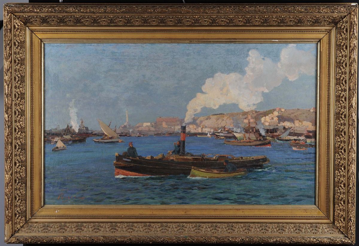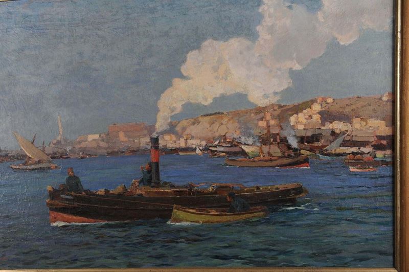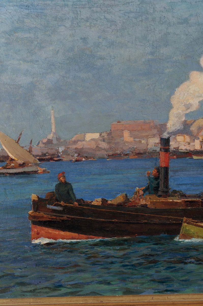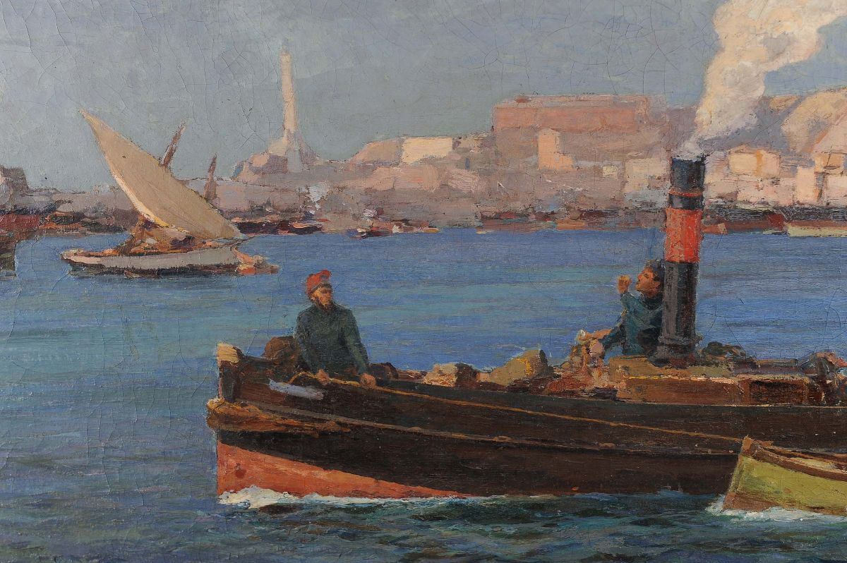 Andrea Figari (1858-1945) Veduta del porto di Genova con rimorchiatori