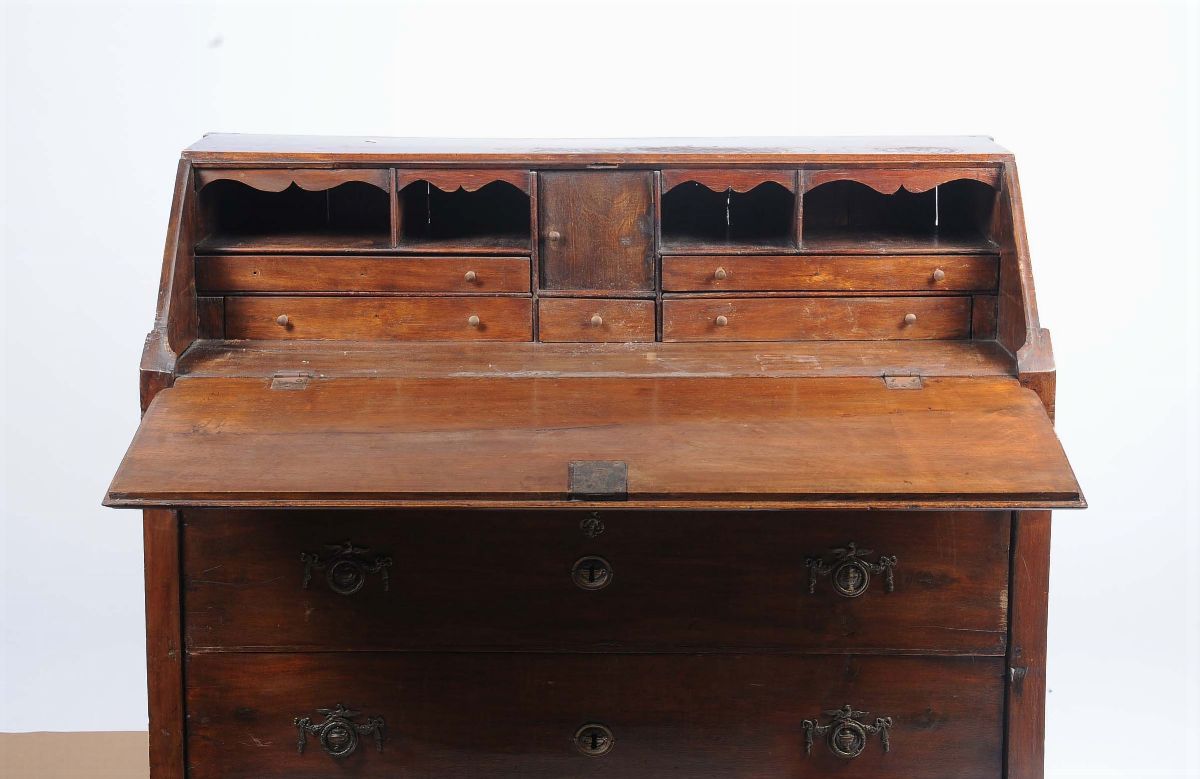 fronte e fianchi dritti, due cassetti più due affiancati sotto la calatoia, cassettini vano a giorno e antina centrale, gambe troncoconiche, cm 117x54x110