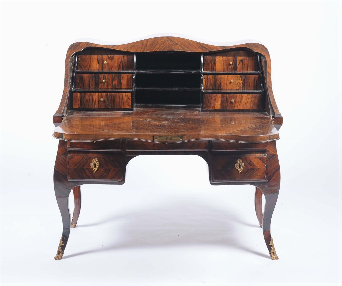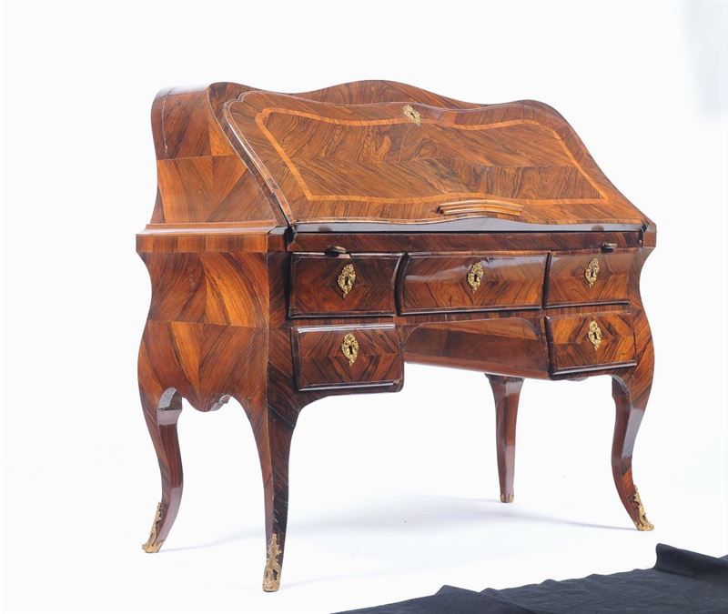 fronte e fianchi mossi, cinque cassettini sul fronte, calatoia che cela vani a giorno e cassetti, gambe arcuate con scarpette in bronzo dorato, cm 114x58x112