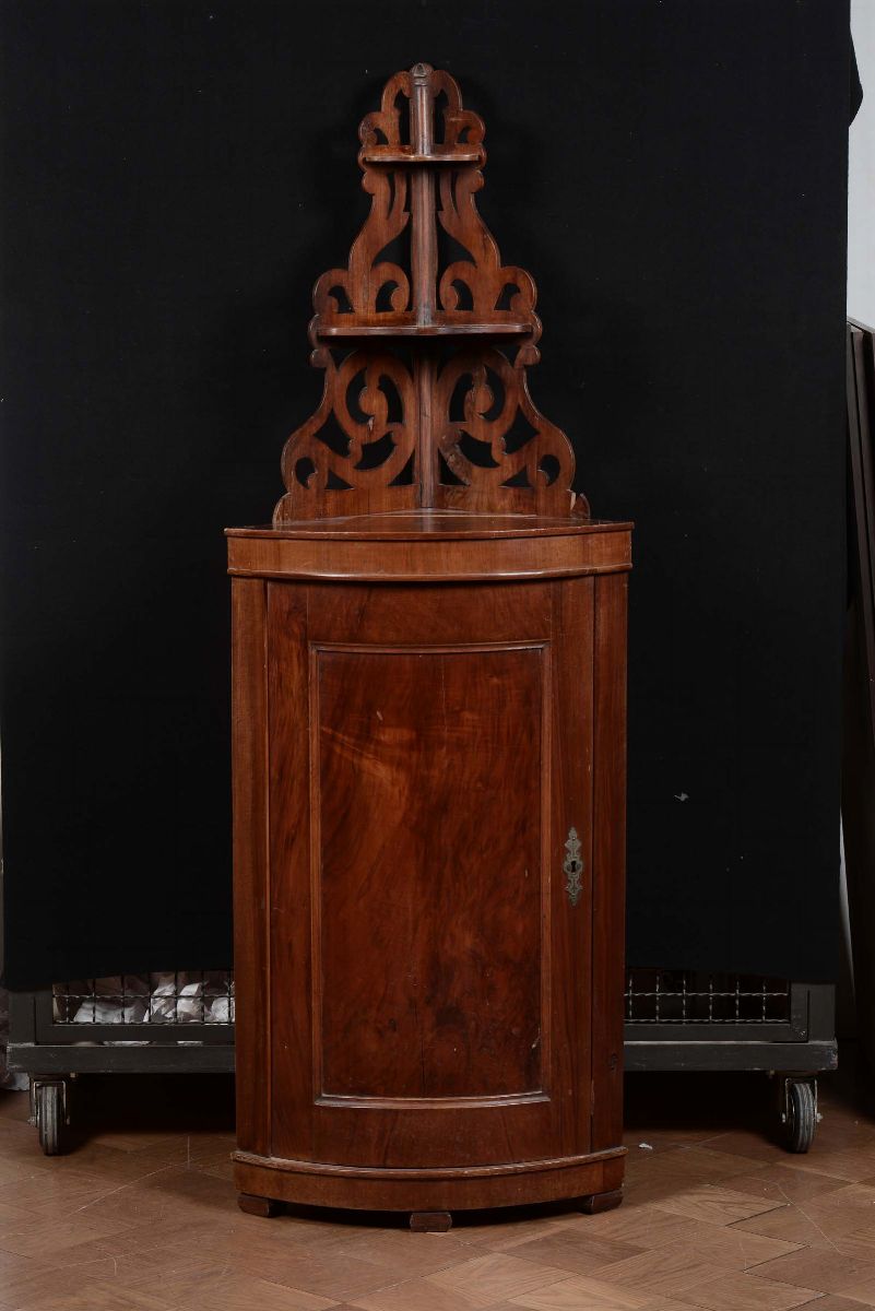 Angolare lastronato in noce con alzatina traforata