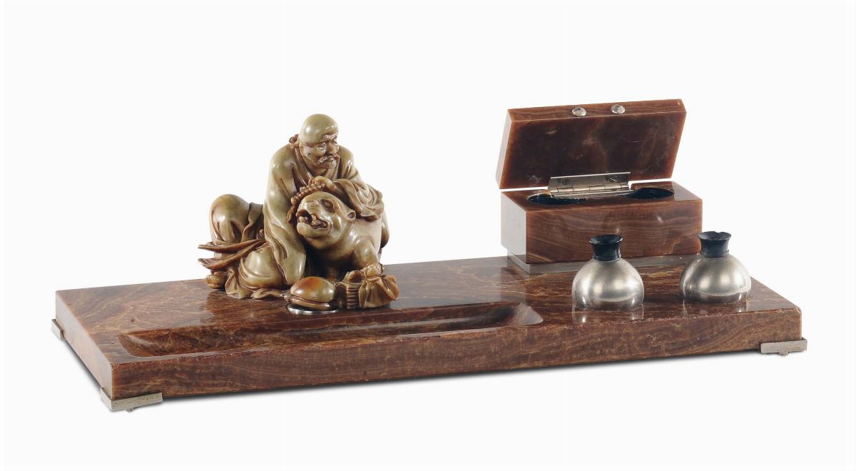 Calamaio in onice con figura in pietra raffigurante saggio, Cina inizio del XX secolo