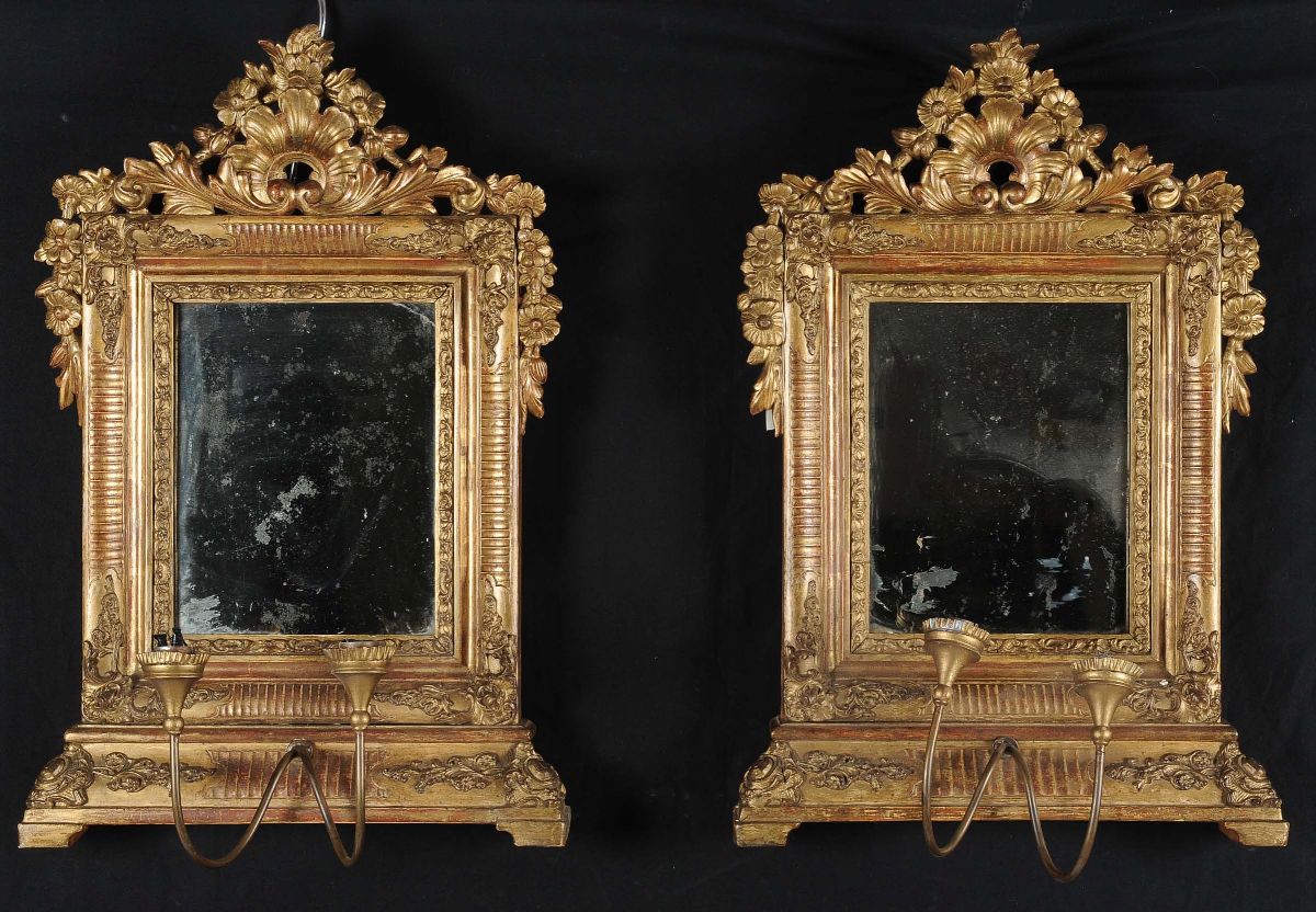 Coppia di appliques in legno intagliato e dorato, XIX secolo