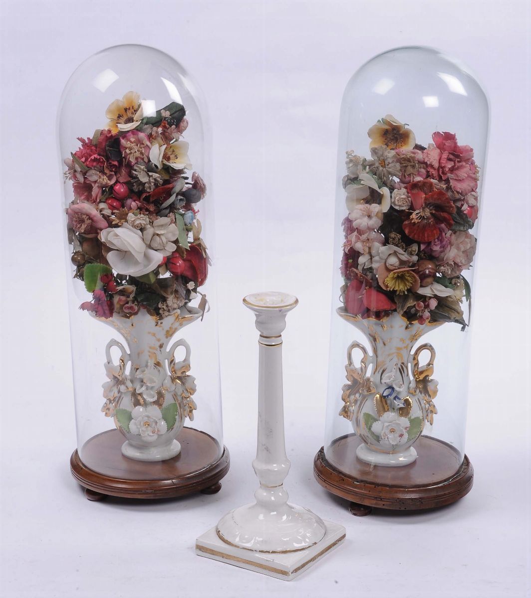 Coppia di vasetti in porcellana con trofei floreali entro teche in vetro