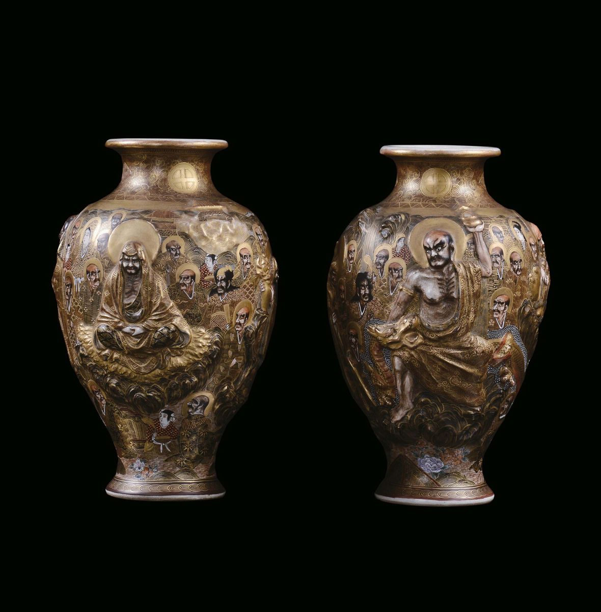 Coppia di vasi Satsuma con decorazione a rilievo su fondo oro, Giappone XIX secolo