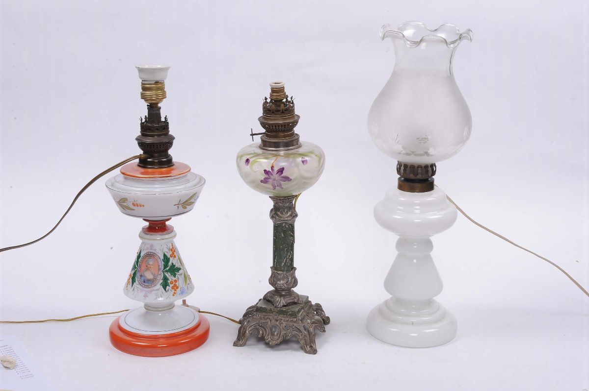Due lumi in vetro e opaline e un altro simile, fine XIX secolo