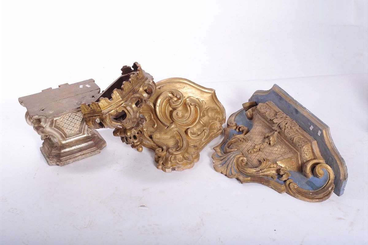 Insieme di quattro mensole in legno intagliato e dorato, XVIII secolo