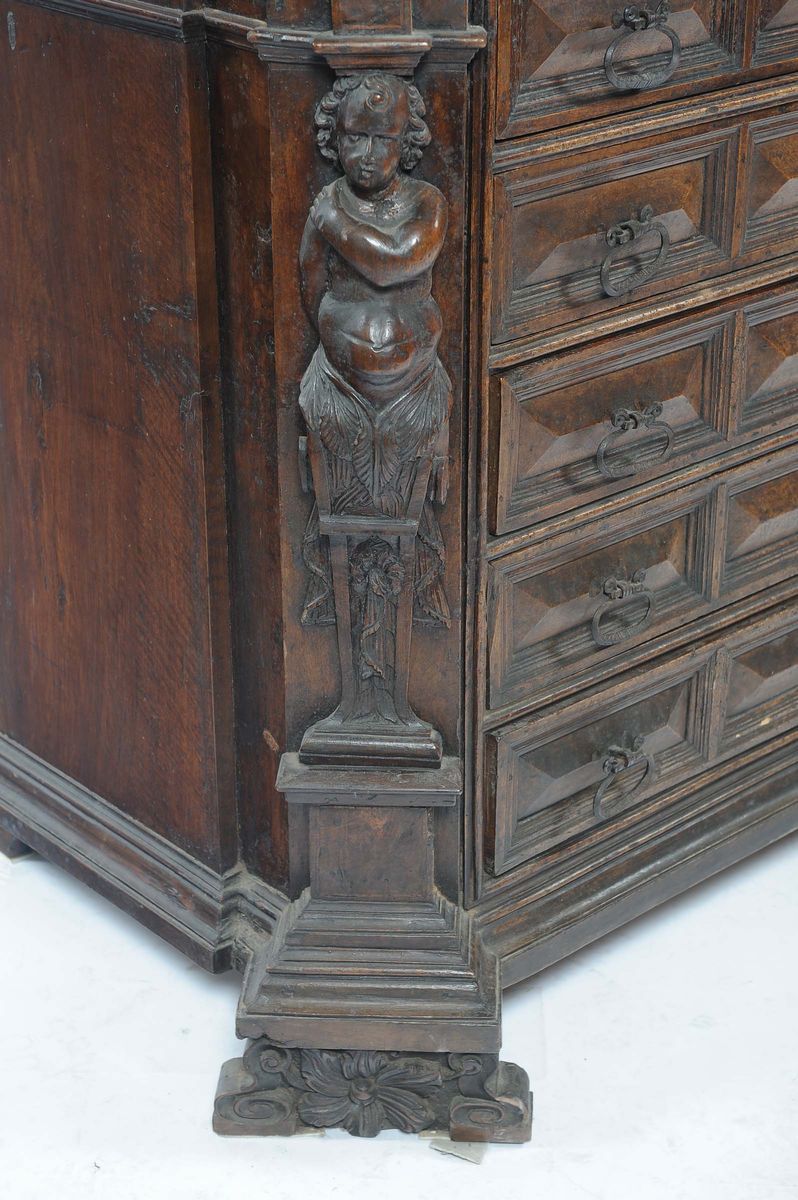 base a cinque cassetti a punta di diamante, montanti intagliati a bambocci, alzata a due ante e due cassettini, cm 142x75x213