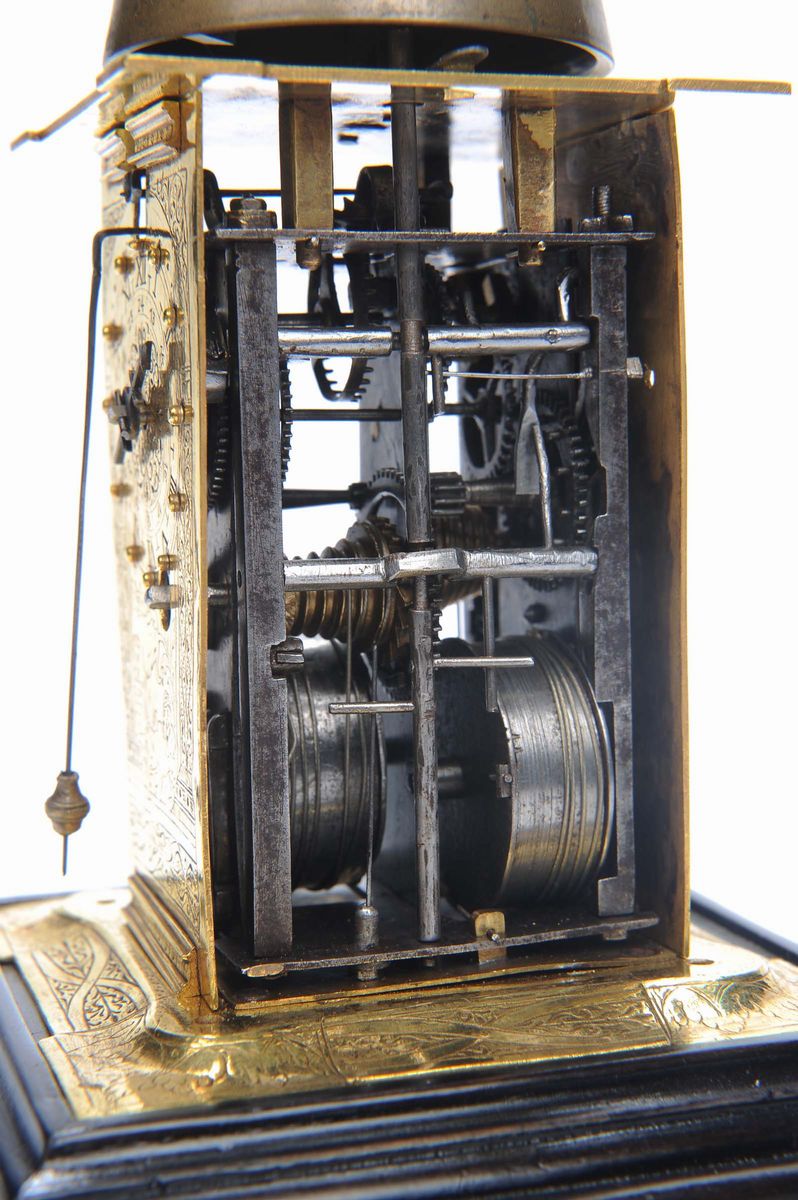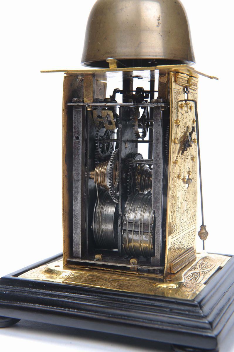 in bronzo e rame dorato, scappamento a bilanciere modificato a verga, suoneria delle ore con indicazione, cm 10x10x21