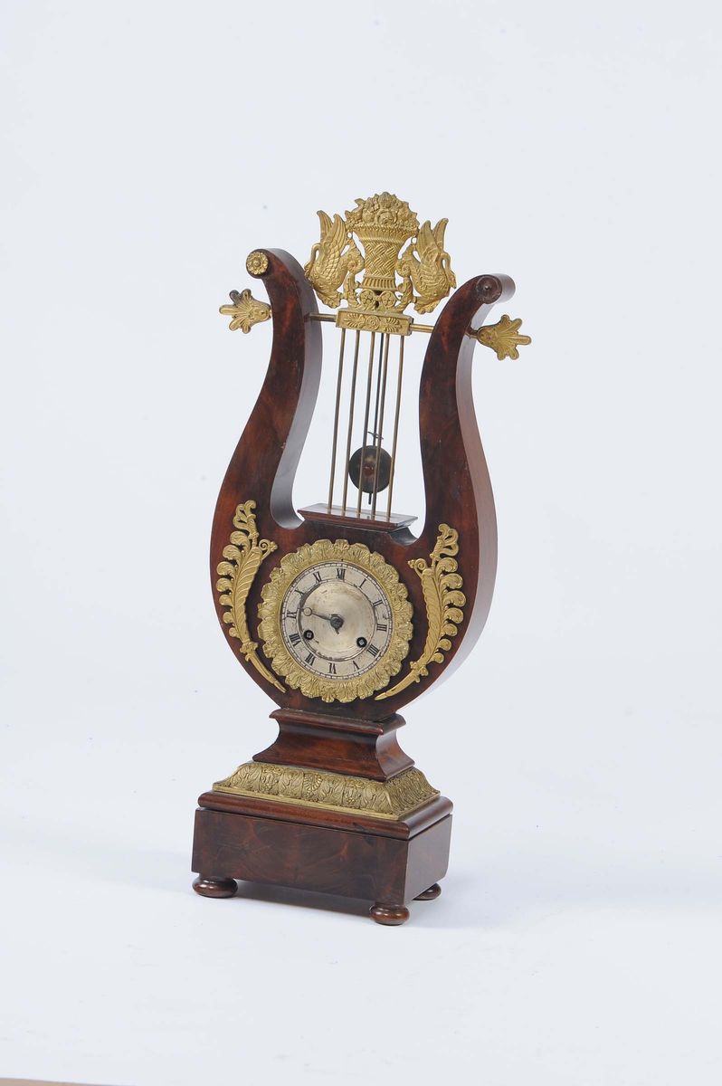 Orologio a lira in legno e bronzo dorato, XIX secolo