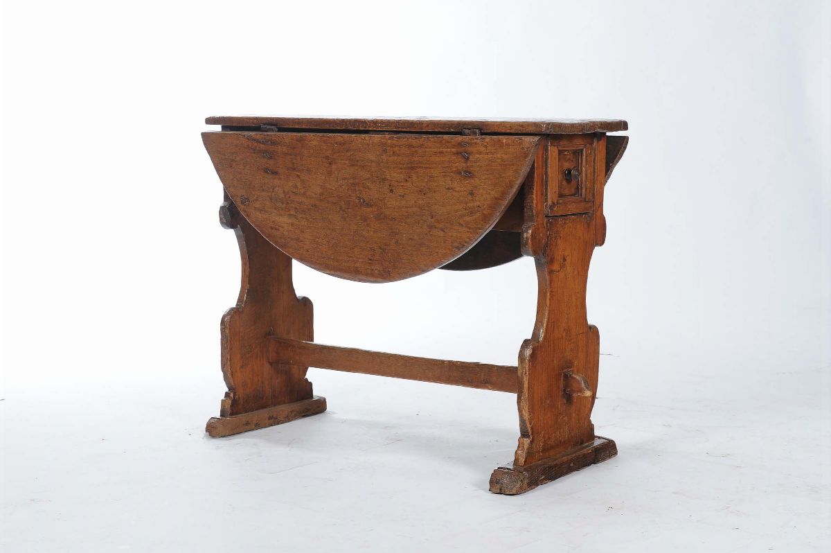 Piccolo tavolo a bandelle in legno di pioppo, XVII secolo