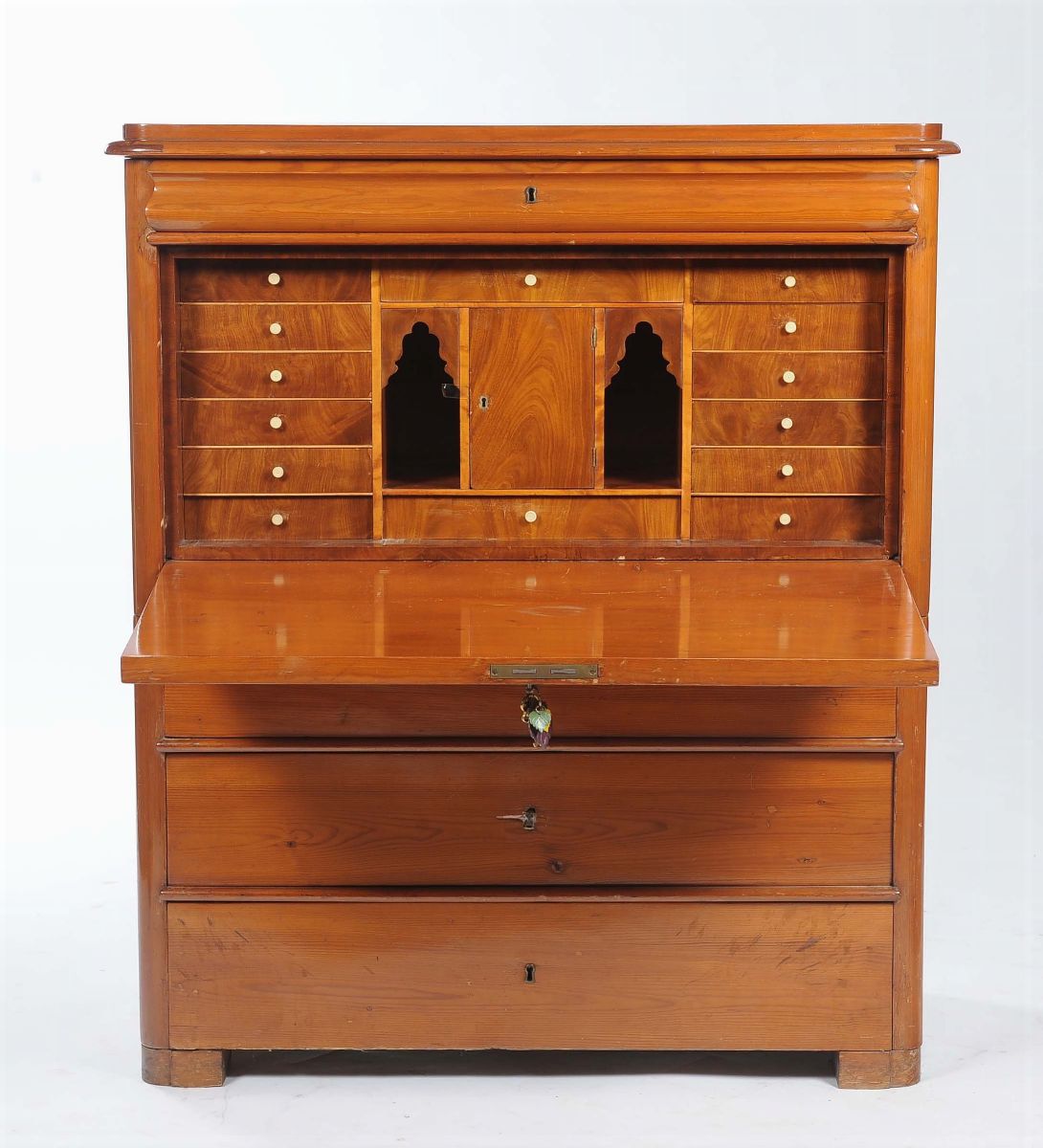 tre cassetti alla base ed uno sulla sommità, calatoia che cela vani a giorno, cm 118x52x139
