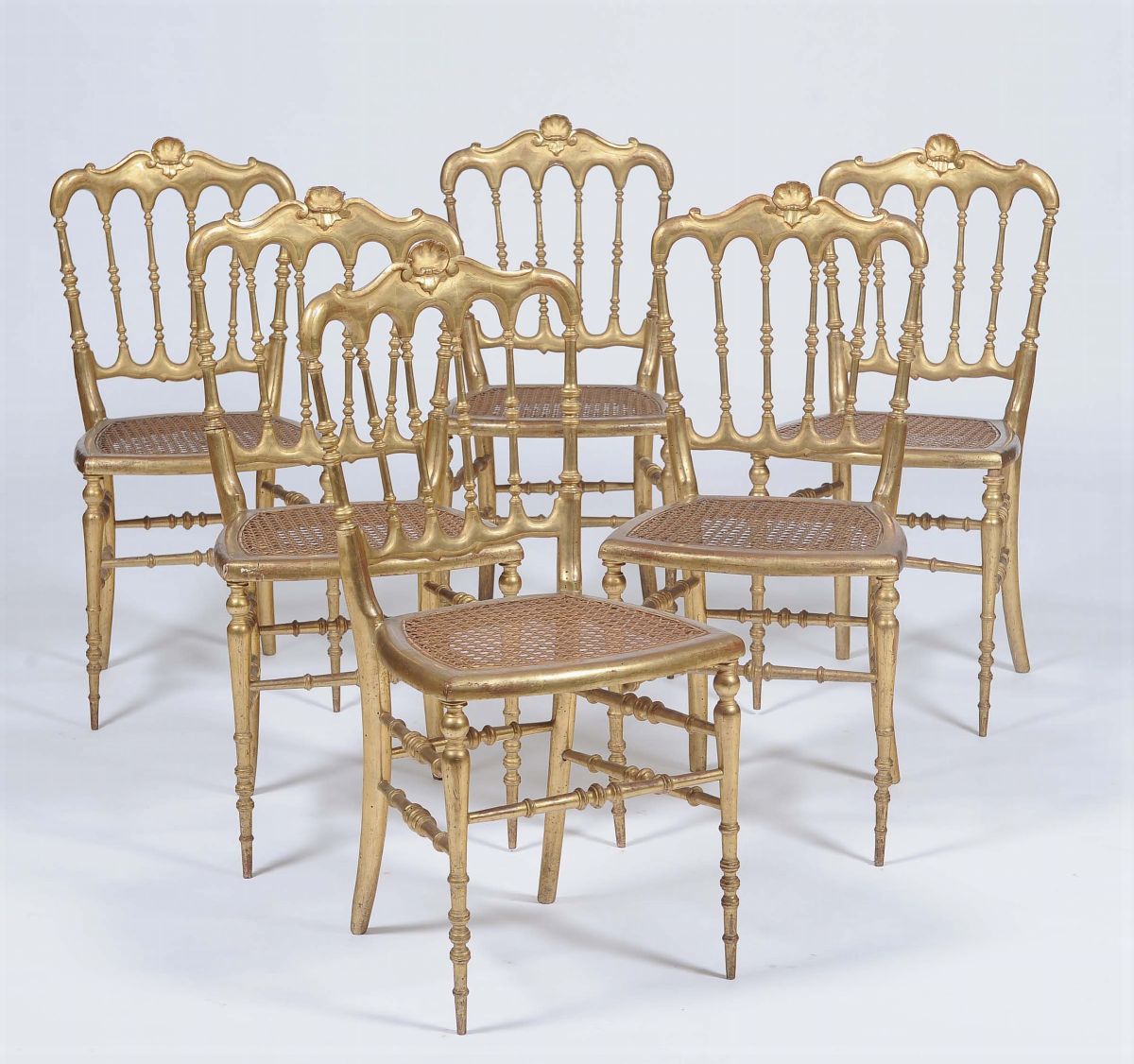 Sei sedie chiavarine in legno dorato, XIX secolo