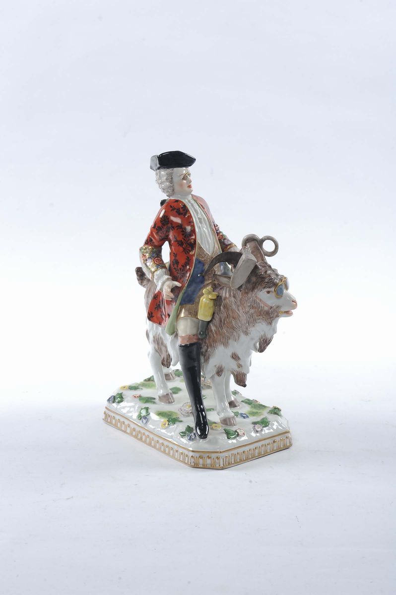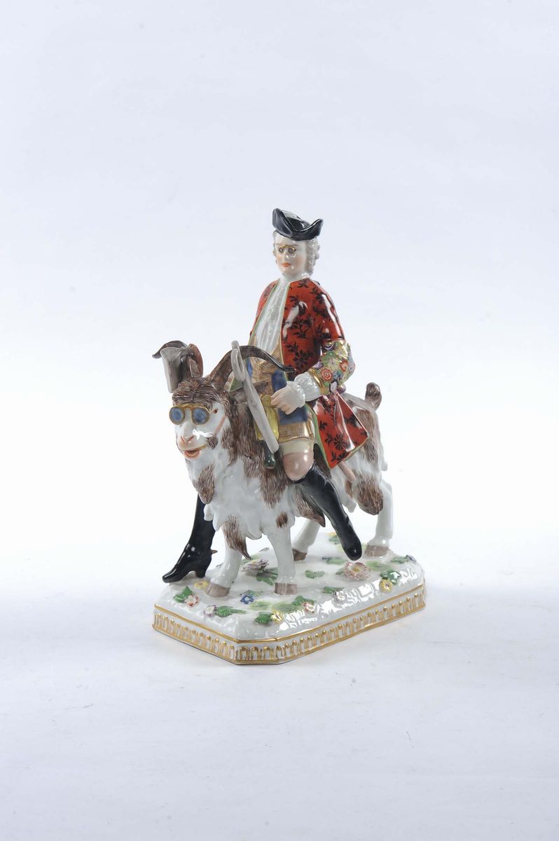 Statuina in porcellana raffigurante figura maschile a cavallo di un caprone