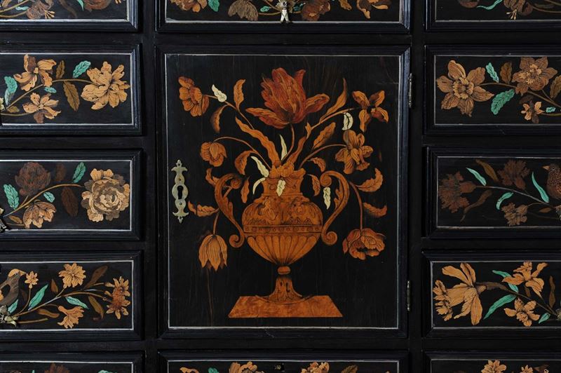 decoro a motivo floreale e uccelli, applicazioni di avorio ed intarsi floreali in legno di frutto su fondo ebanizzato, numerosi cassettini e sportello centrale, base con alte gambe a torchon riunite da traverse, cm 127x47x180