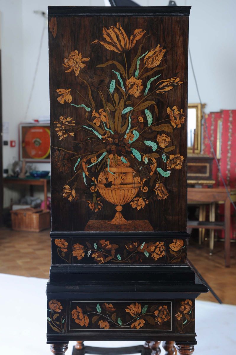 Stipo interamente lastronato e finemente intarsiato in essenze pregiate, Olanda XVIII secolo