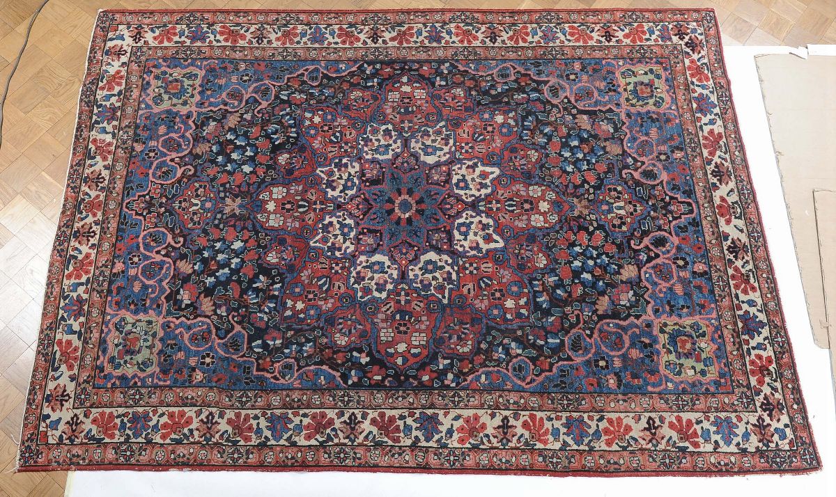fondo blu con medaglione centrale marrone e rosso, cm 308x220