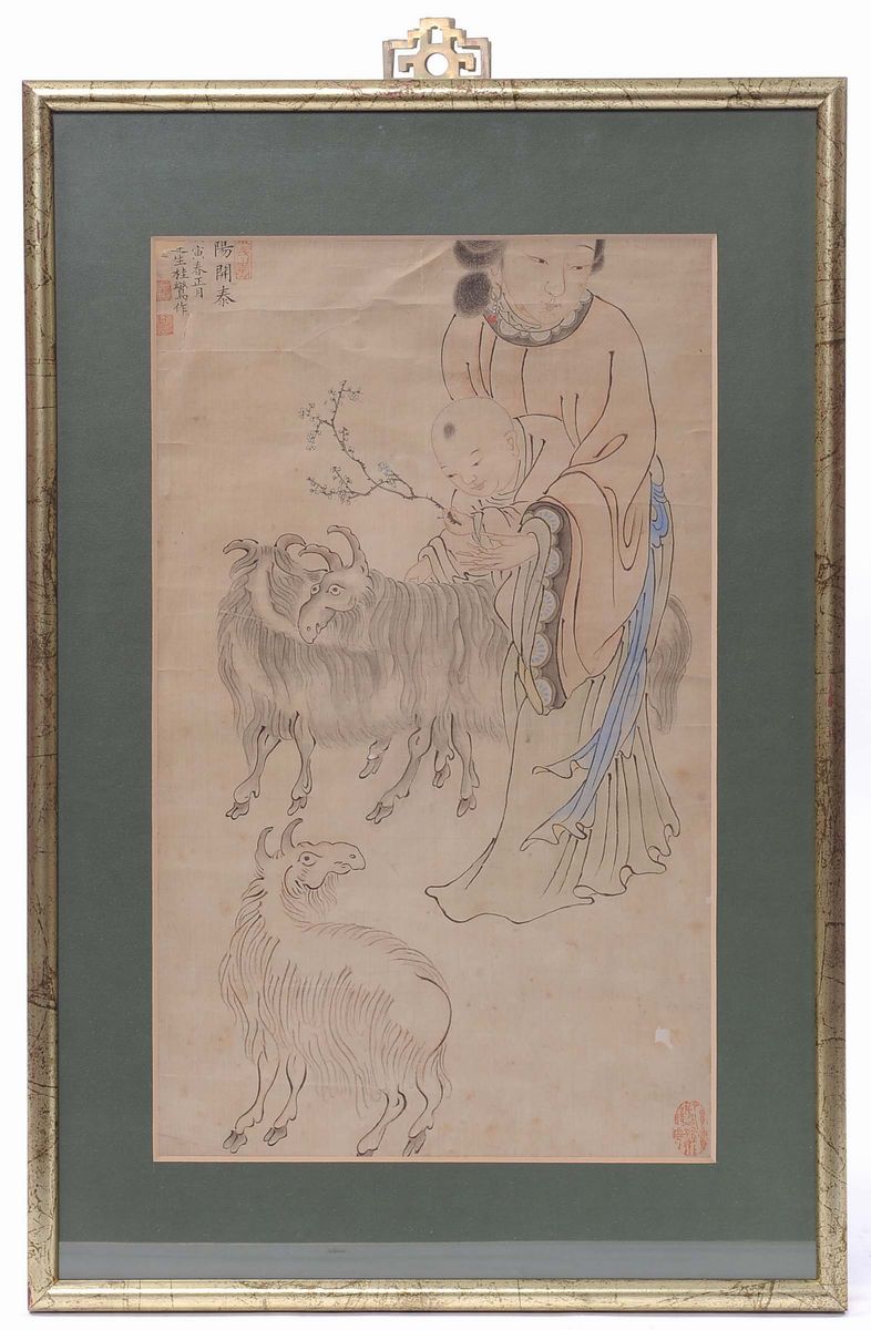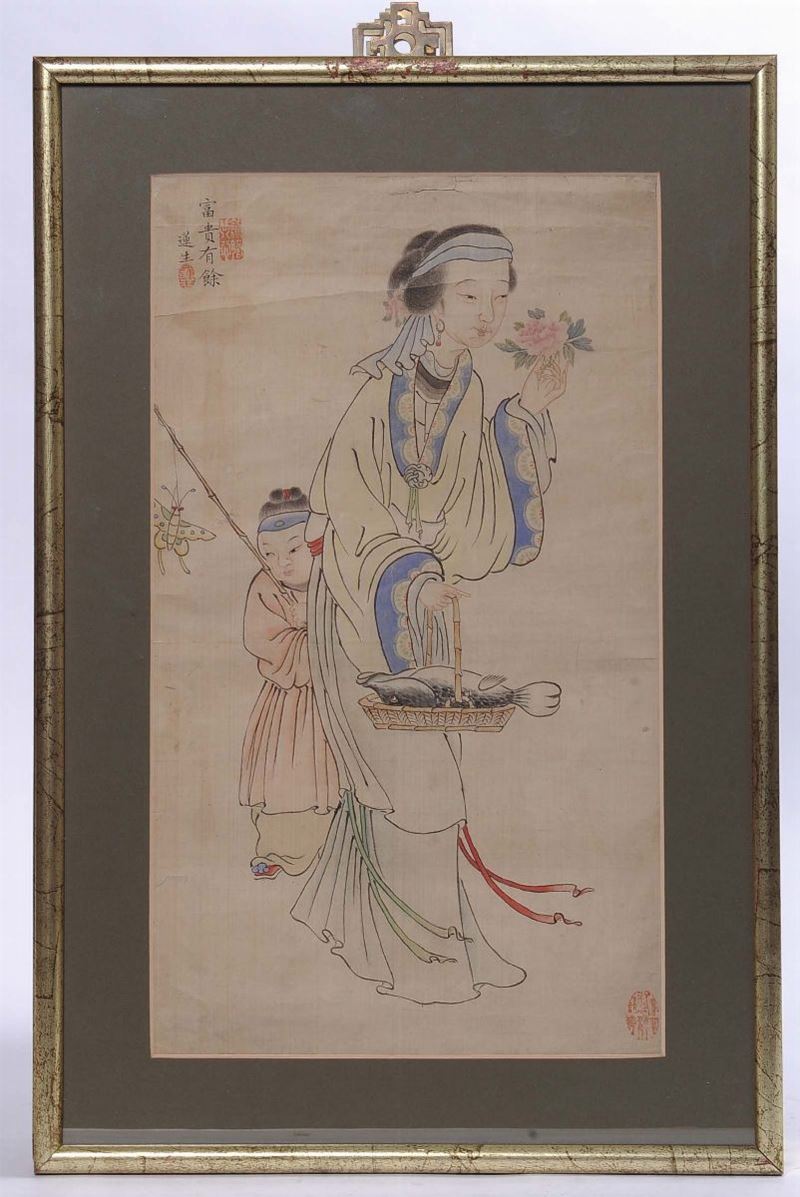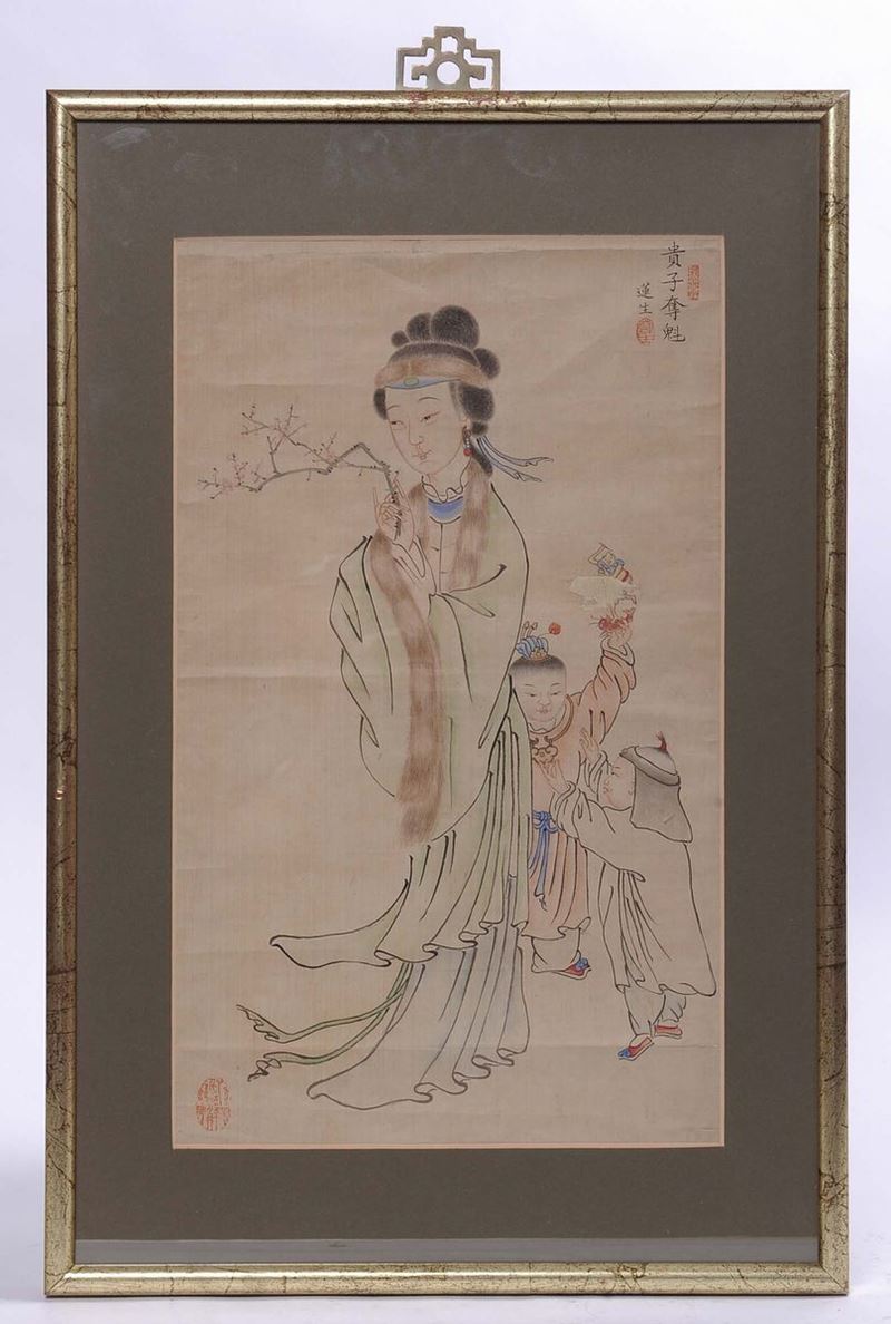 Tre dipinti su seta con figure femminili e bambini, Cina