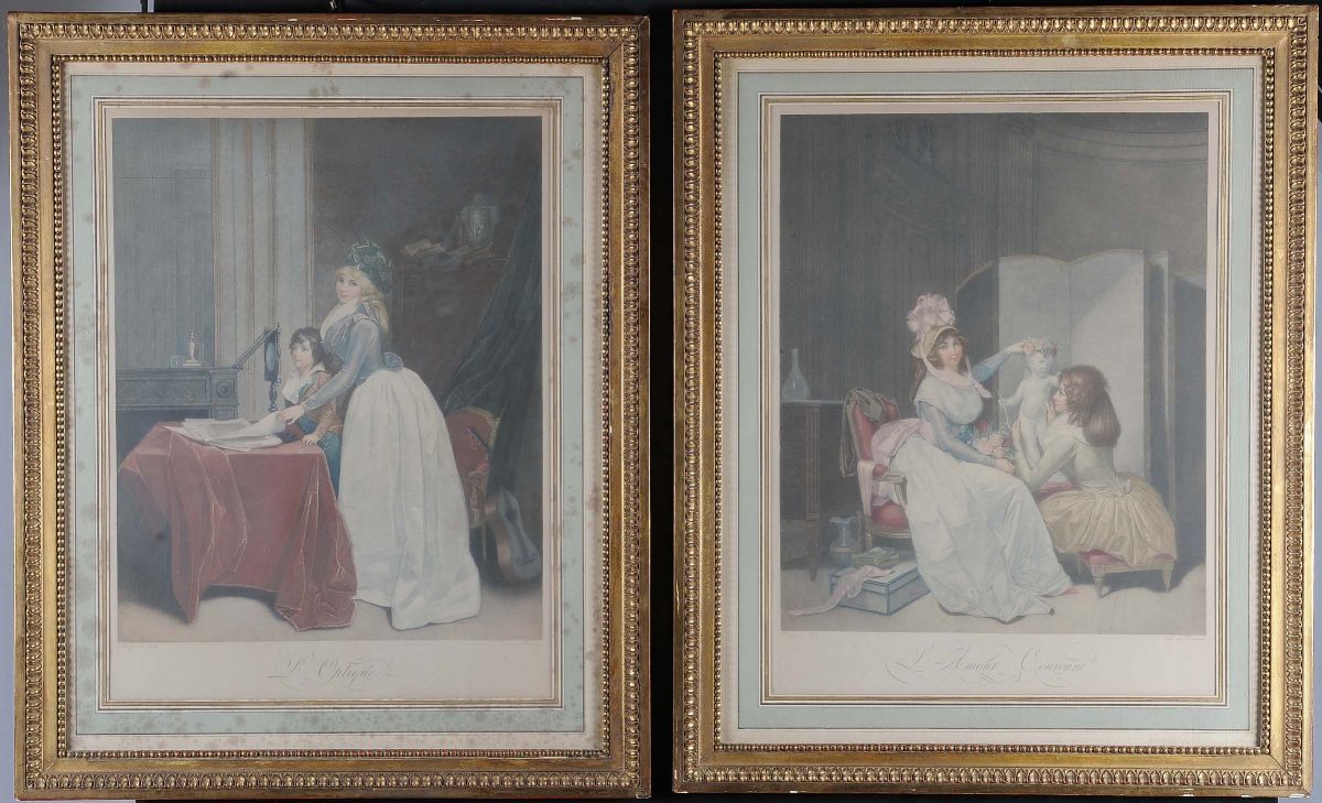 Tre stampe francesi con figure femminili in cornici dorate