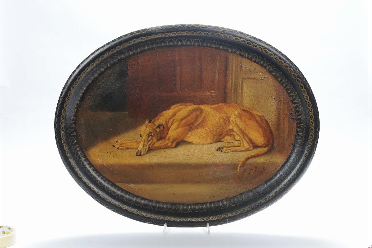 decoro con levriero dipinto ad olio, cm 63x48 (difetti)