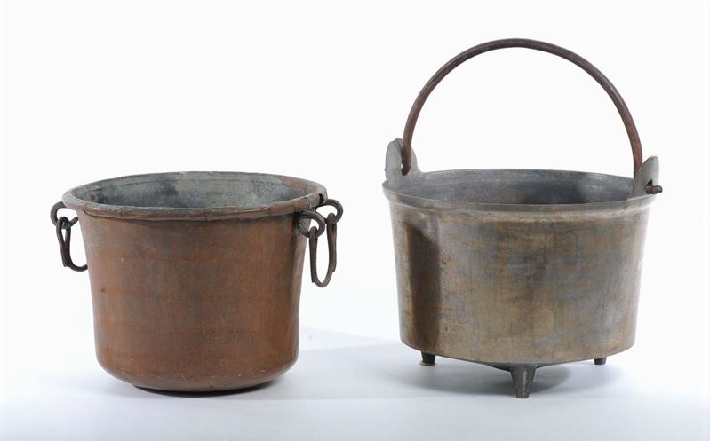 Due ciotole in rame e una brocca in vetro