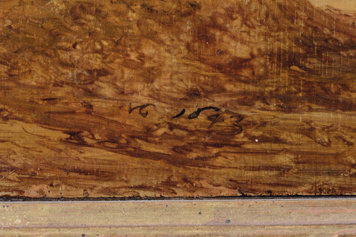 olio su tavola, cm 25x33, siglato e datato: VG 1643