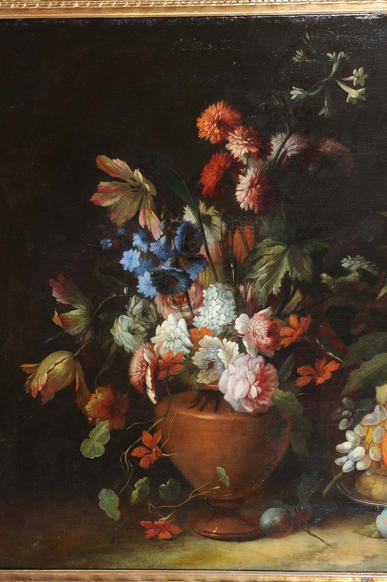 Scuola Fiamminga della fine del XVIII secolo Natura morta con vaso di fiori e frutta in vassoio