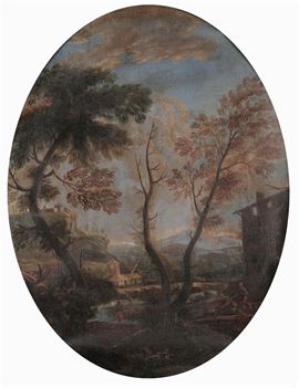 coppia di dipinti ovali ad olio su tela, cm 92x68, in cornici dsorate