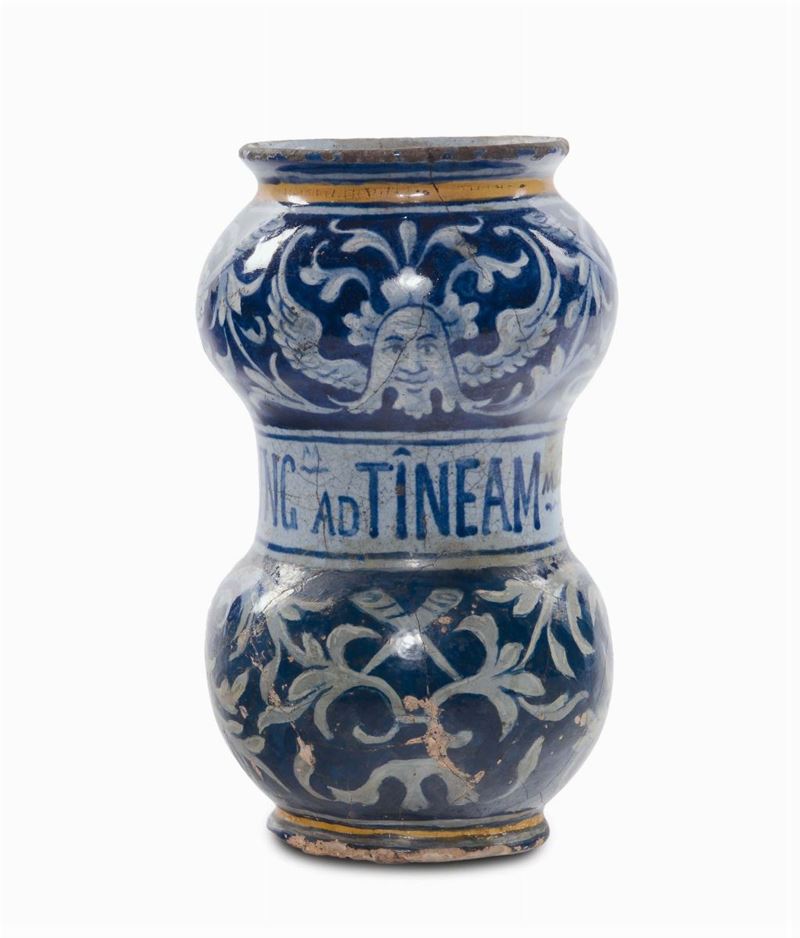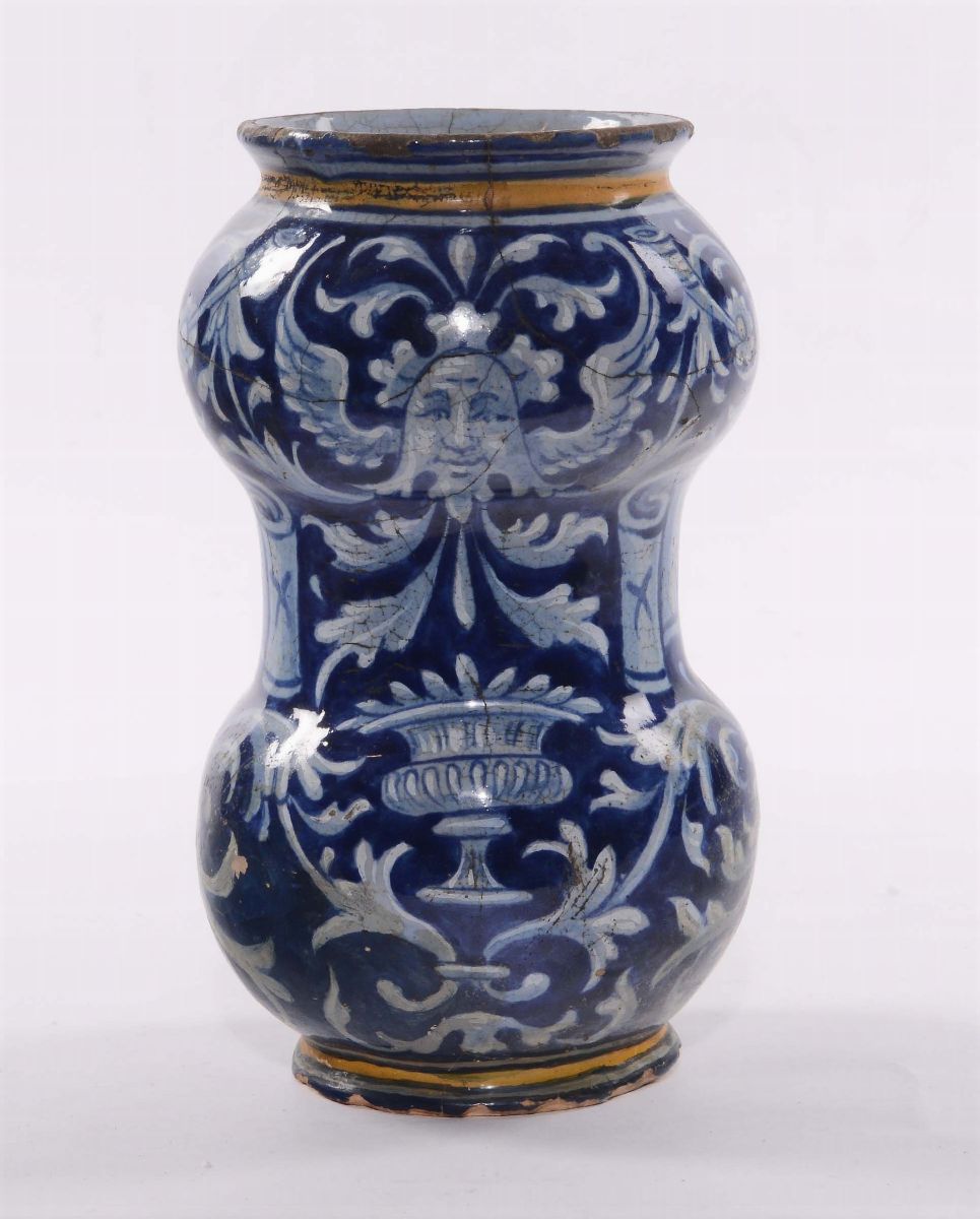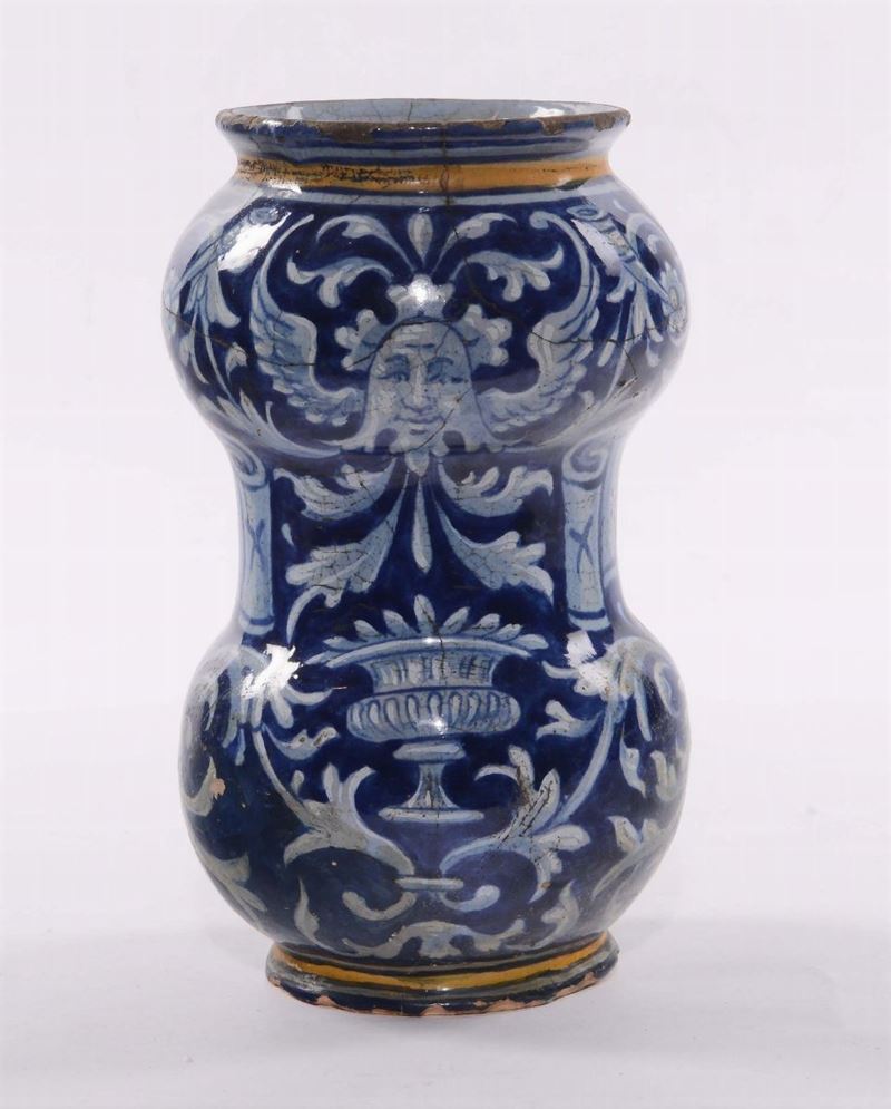 Albarello di farmacia in maiolica con decoro a grottesche, imitazione del XIX-XX secolo