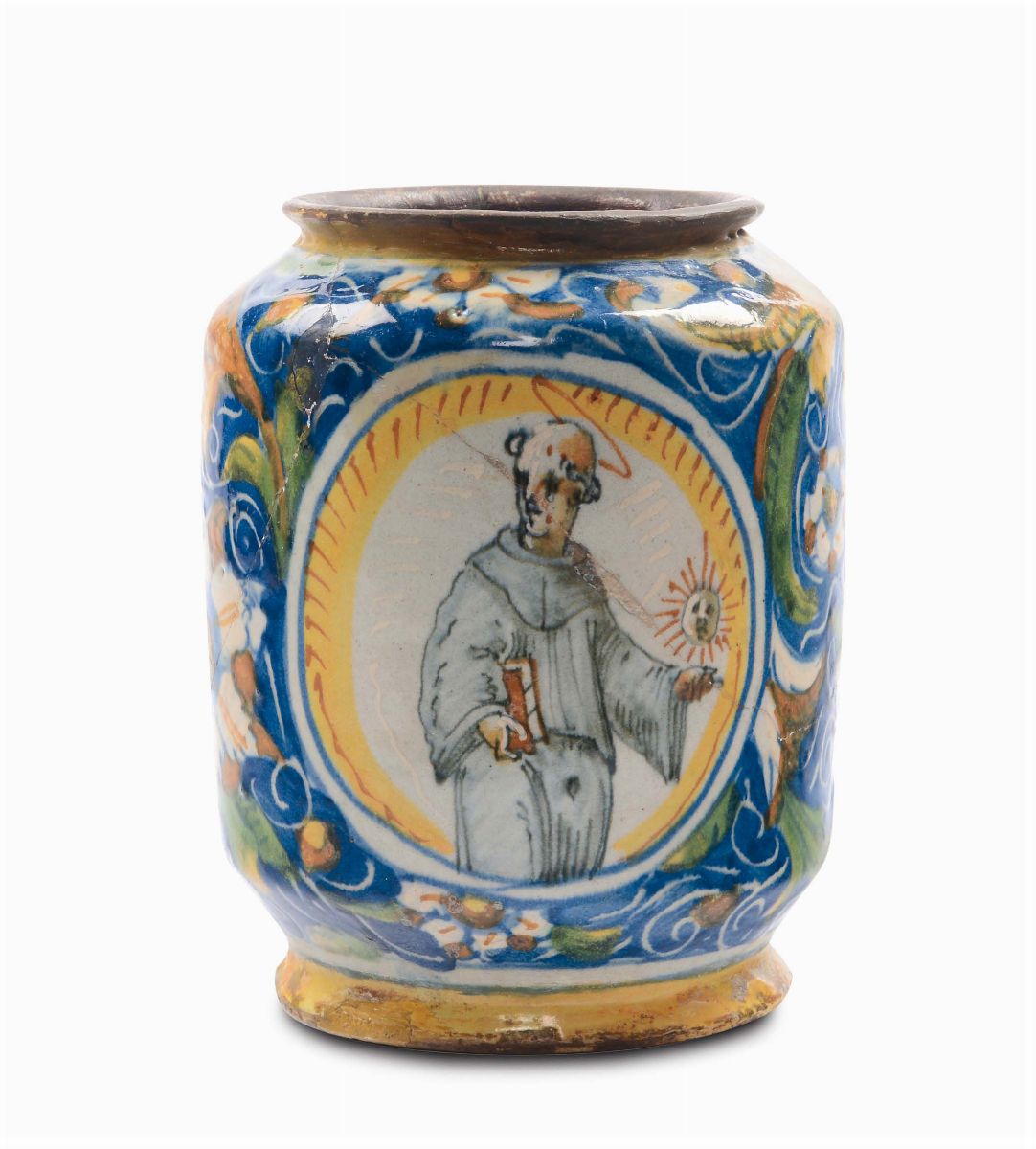 vaso cilindrico con orlo e piede svasati, decorazione floreale policroma su fondo blu, doppio medaglione con santi in preghiera, altezza cm 17 (rotture e restauri)