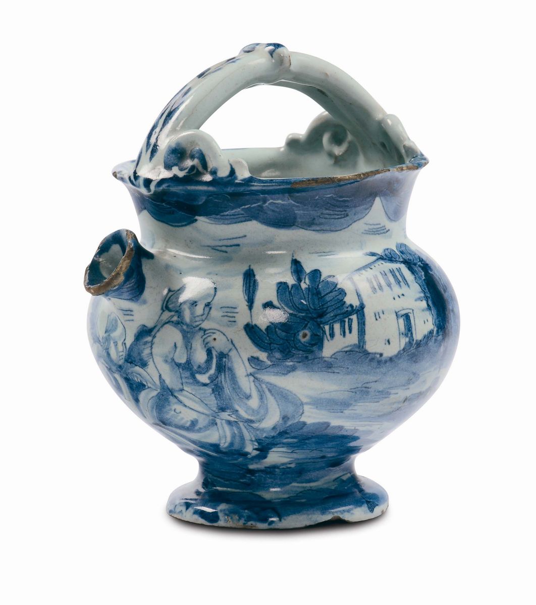 Boccale in maiolica con manico a canestro e decorazione “a scenografia barocca”, Savona XVII secolo