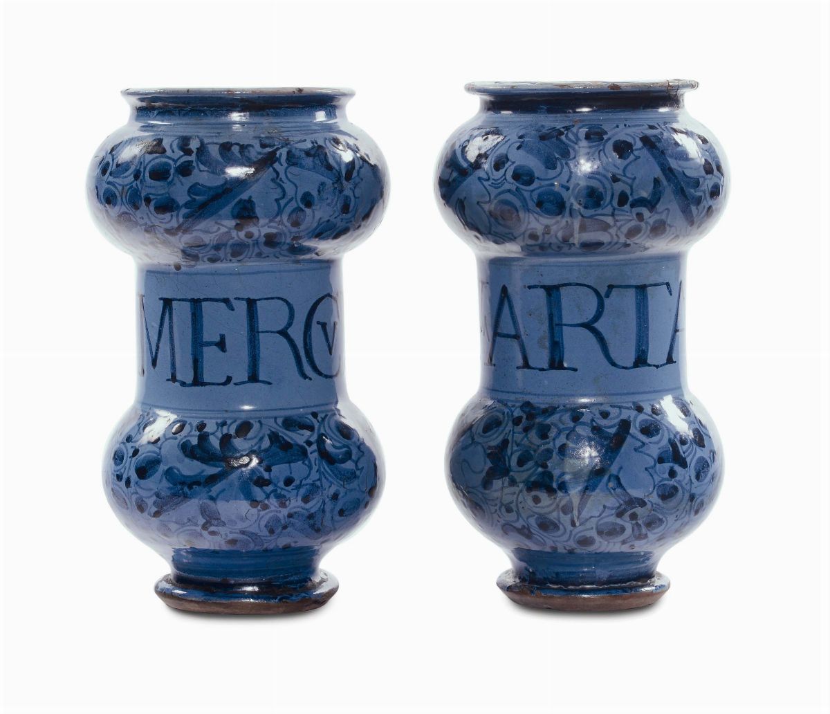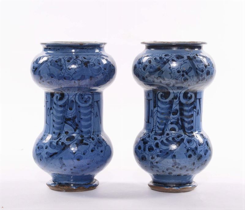 Coppia di albarelli di farmacia in maiolica dipinti alla veneziana, Roma fine XVI secolo-inizio XVII secolo