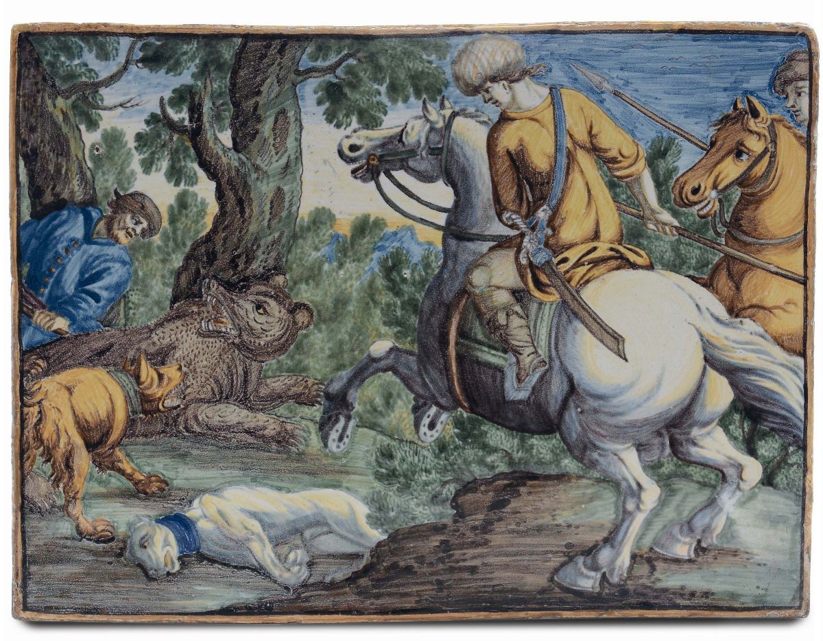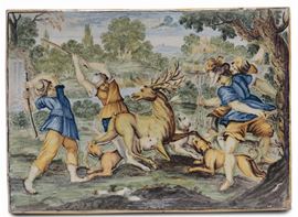 Coppia di mattonelle in maiolica raffigurante scene di caccia, Castelli XVIII secolo
