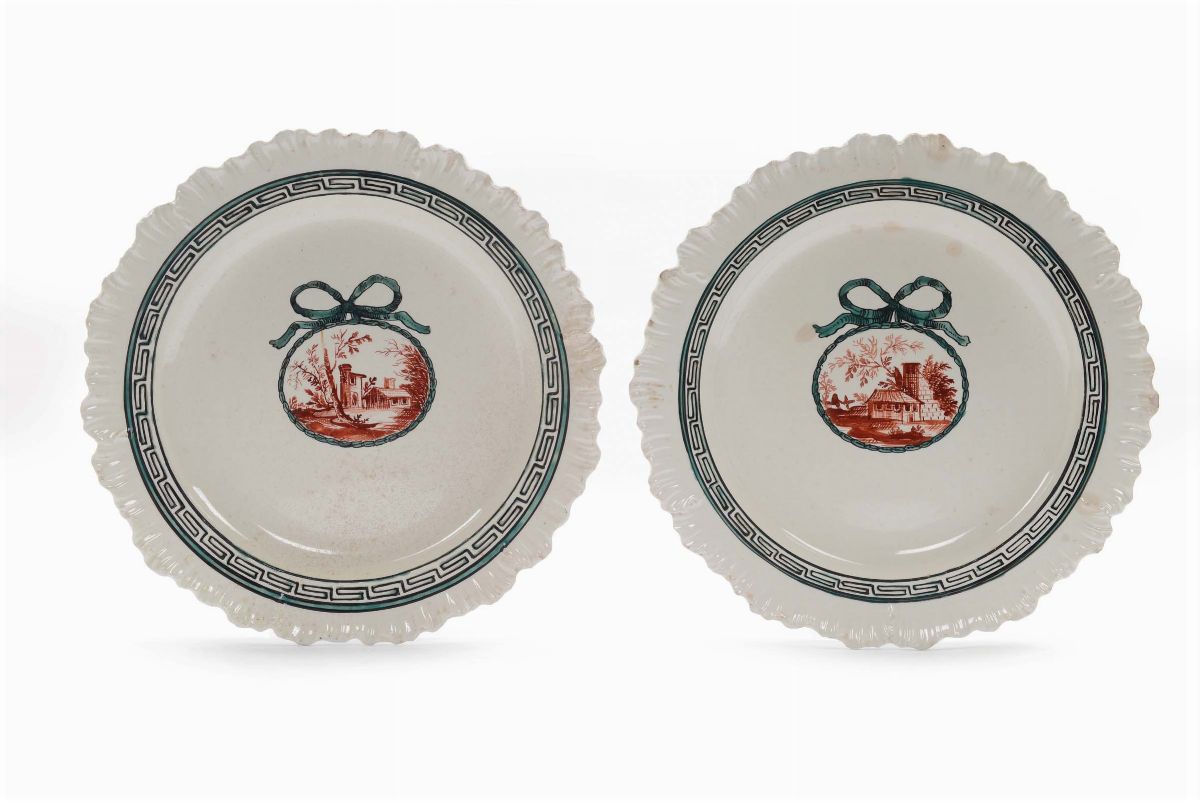 Coppia di piatti in terraglia con decoro di paesaggi, Jacques Boselly, Savona XVIII secolo